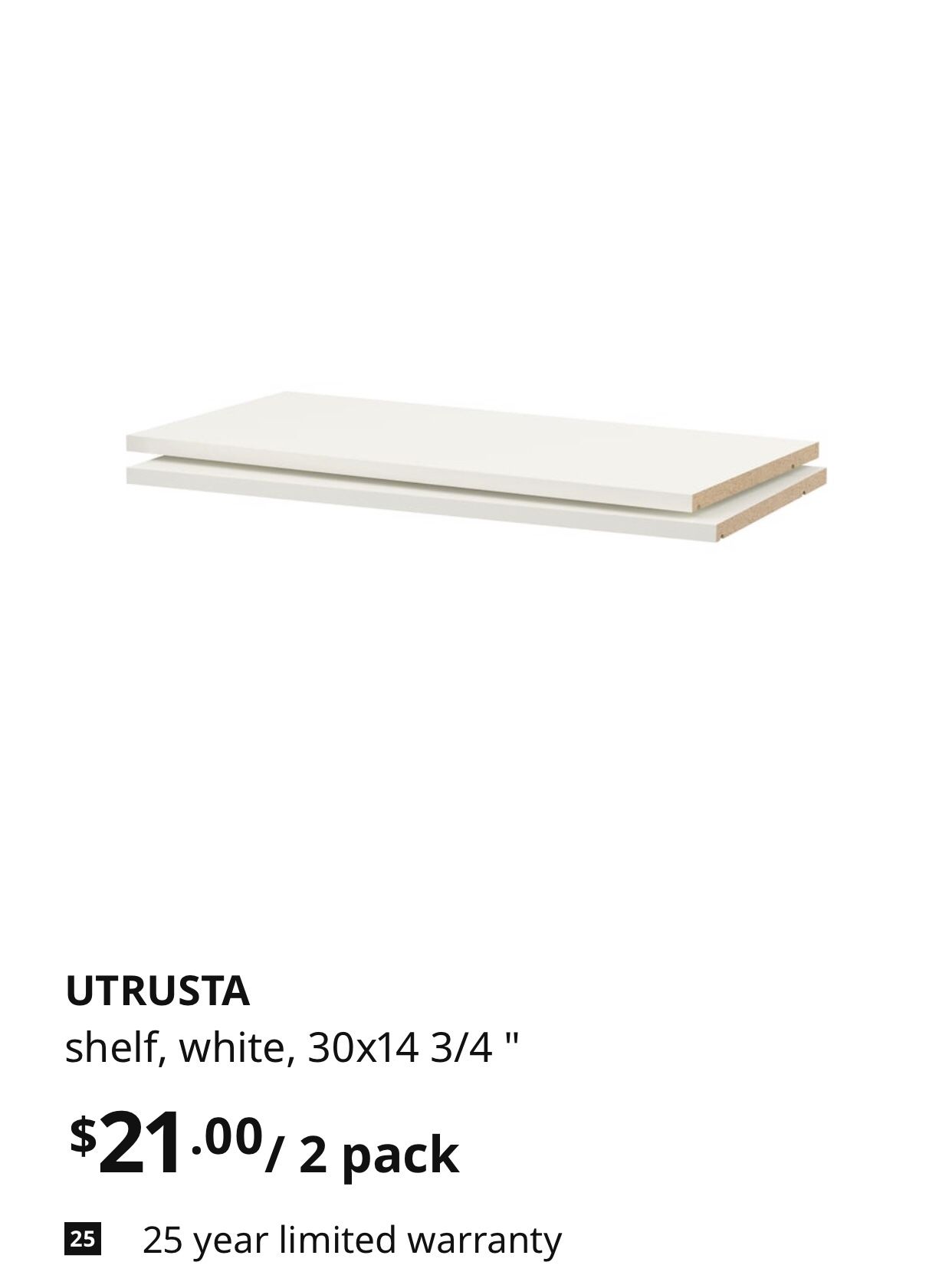 I have four IKEA Utrusta shelves that can go with any 30” wide x 15” deep cabinet. Or you can use as floating shelves. Ordered too many and have these left over. Never used. Images are from Ikea…everything brand new in perfect condition.