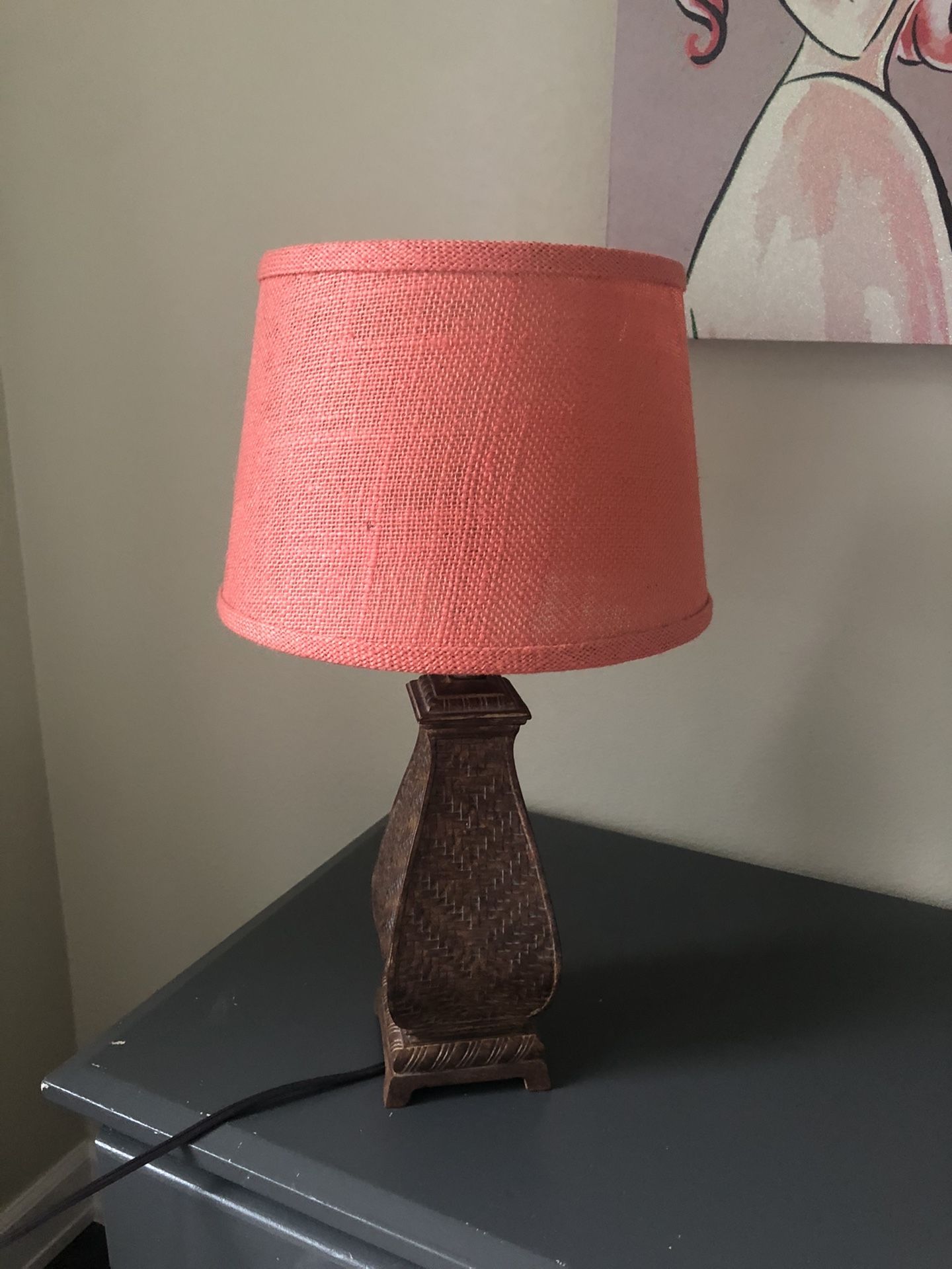 Cute table lamp with wicker base and blush shade 18” high by 10” wide