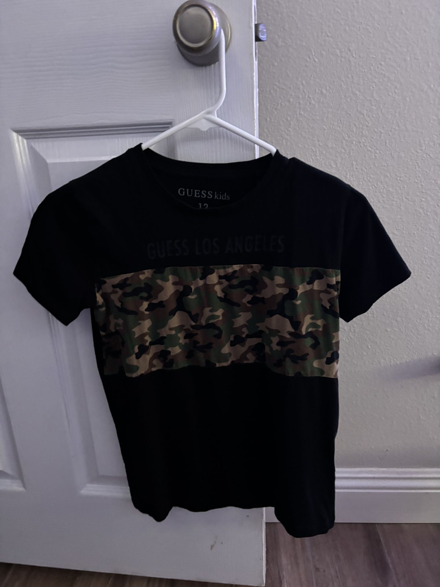 A black guess t- shirt with black lettering on the front and camo print on the front