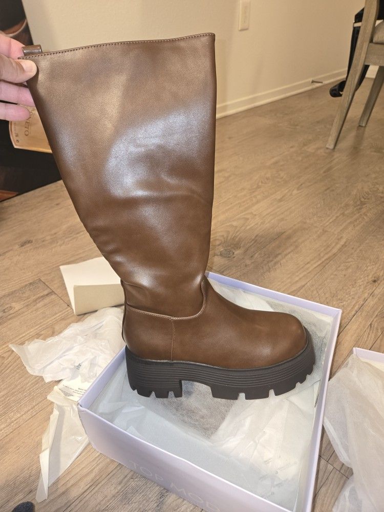 Brown long super cute boots brand new still in the box from FASHION NOVA size 6 1/2 boot says 6 1/2 but its a size 8 paid $35 for them