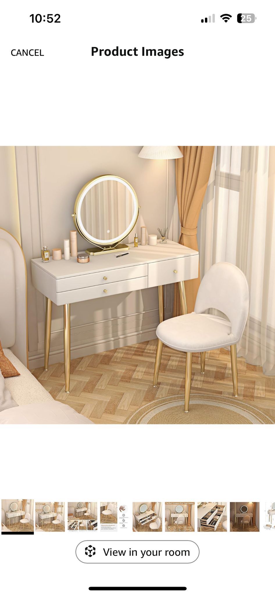 We bought two vanity, this one is not needed. It’s brand new., we opened to inspect but never set it up. Beautiful makeup vanity set in box 3 draw with scratch proof Rotating mirror Cozy stool with adjustable backrest Desk - 39.4 (w) x 31 (h) Stool - 31.5 (h) Mirror - 16.5 (h) Pickup only Cash only
