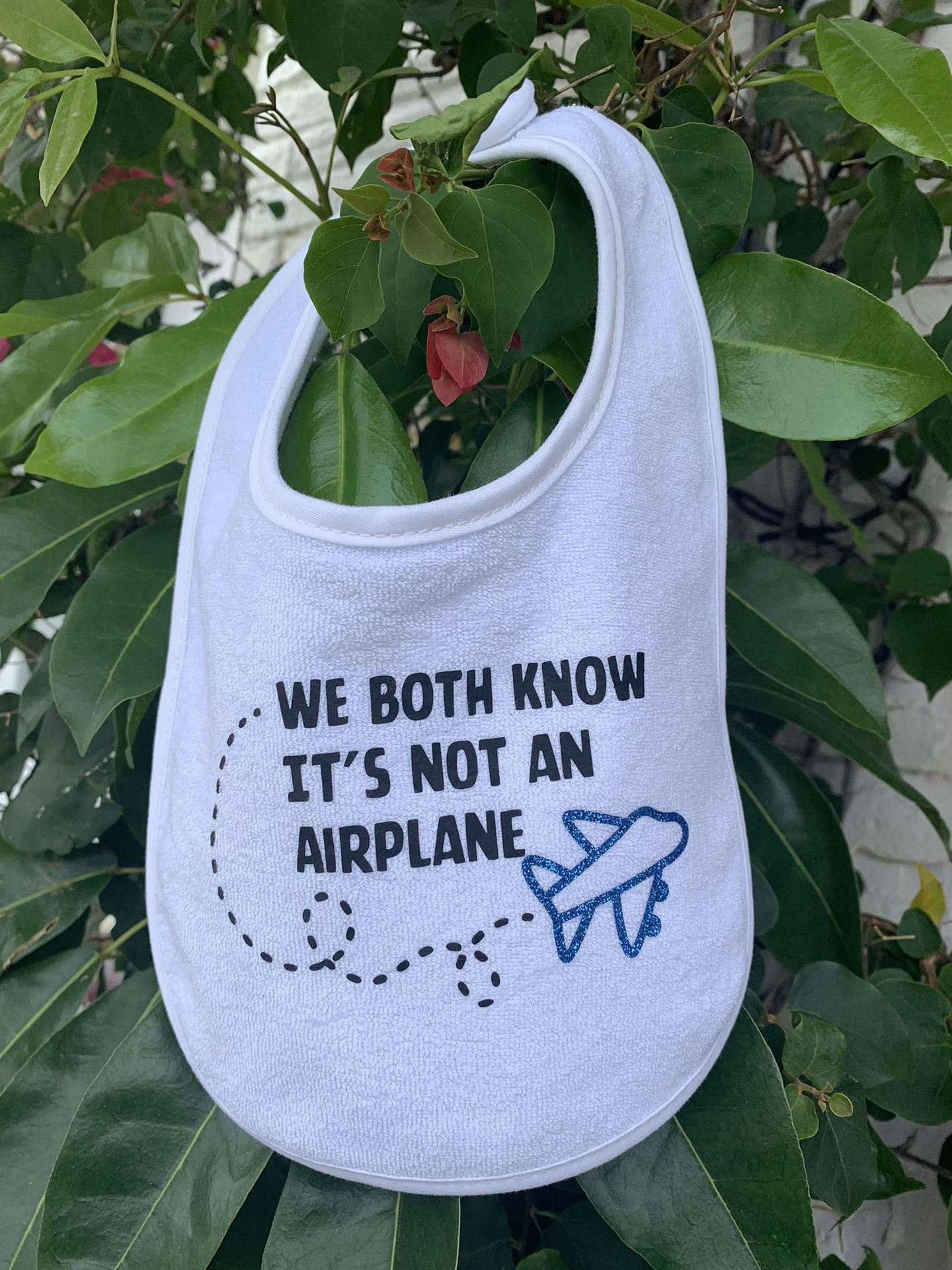 Funny bib with “ we both know it’s not an airplane” Handcrafted with regular and glittered vinyl on terry cloth bib Bibs are blend of 65% Cotton and 35% Polyester making for easy washing Wash in cold Water Use a mild detergent No Bleach Line Dry or Dry on low setting Style A- 12” x 8” with Velcro closer Style B- 12” x 7” with Metal Clasp Closer Please contact for color Availability and also to have the bib customized with certain colors. Please note that colors and availability may very .