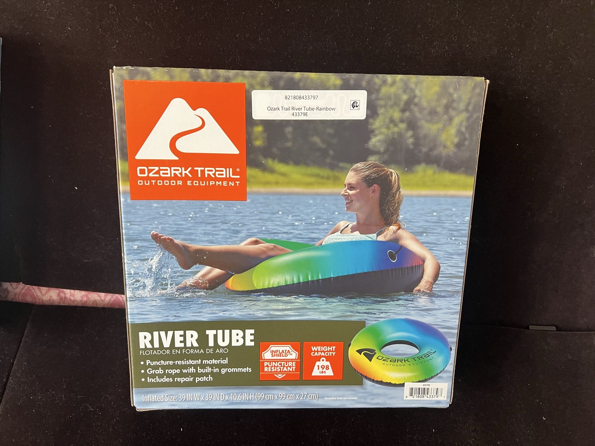 Brand new, never opened Ozark Trail 39-inch River Tubes! This set includes one vibrant rainbow tube and one bright lime green tube. Perfect for the river, lake, or pool this summer. Features: • Size: 39" Diameter (99 cm x 99 cm) • Durability: Made with puncture-resistant material and "Inflata-Shield" technology. • Convenience: Includes a heavy-duty grab rope with built-in grommets for easy carrying or tying together. • Capacity: Supports up to 198 lbs. • Extras: Includes a repair patch in each box. Both are still factory-sealed in their original boxes. Great for a quick weekend getaway!