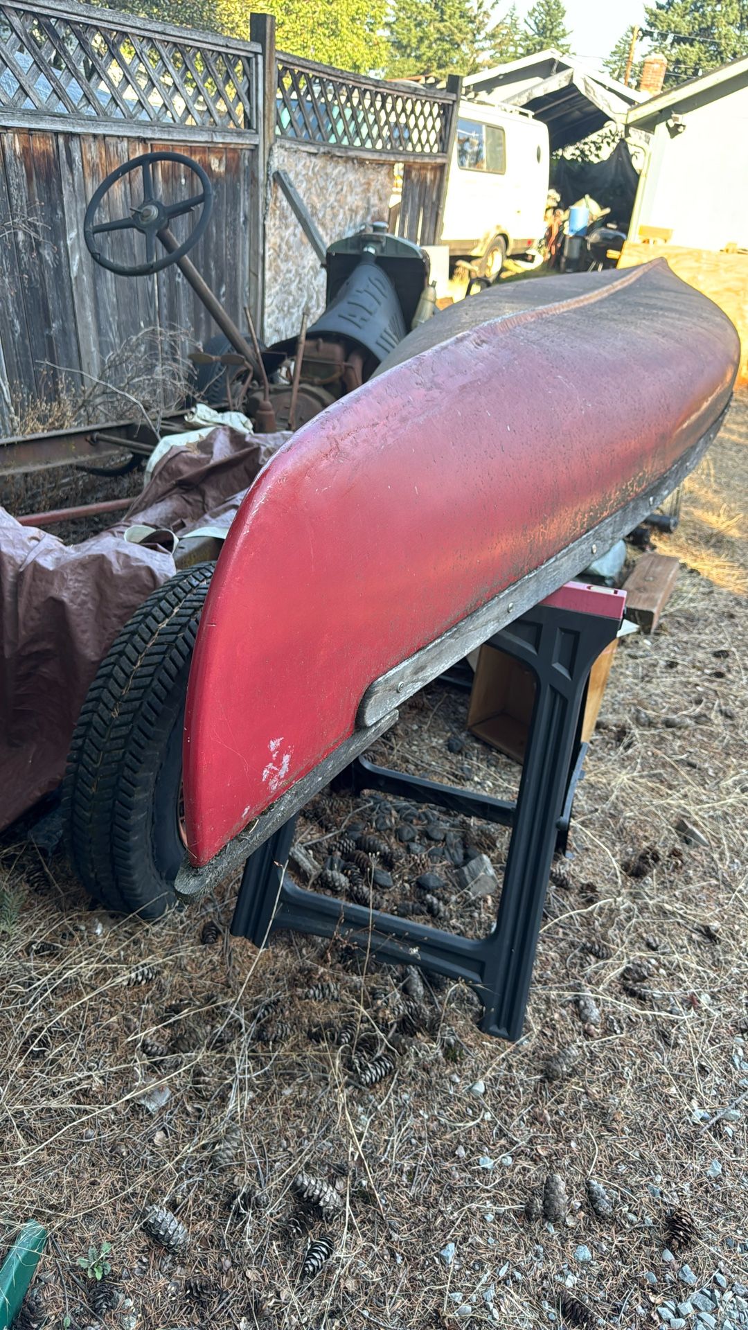 My dad built this red canoe like 20 years ago and repatched and painted it red. It’s been outside. Wood on the side could use refinishing. It’s red. Also it’s like 9 feet long at least… maybe 11feet. Its red. It’s big. Also its red