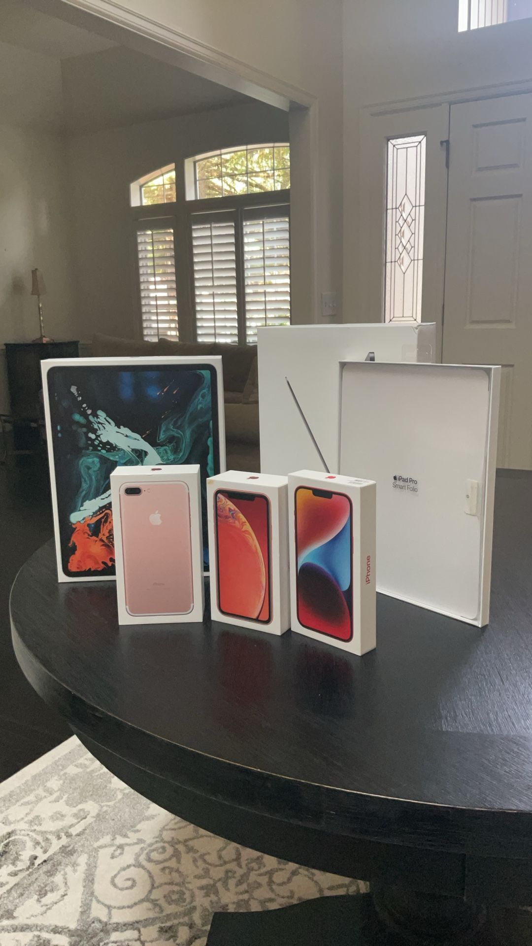 All in great condition. Would like to sell them together iPhone 14plus iPhone 6 silver iPhone 7 Plus iPad Pro MacBook Pro13 in iPad Pro Smart Folio 12.9in