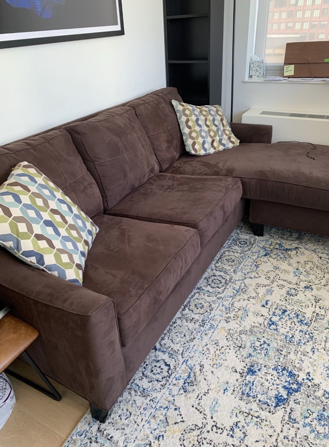 Comfortable Back and Seat Cushions, Smooth Brown Fabric, Reversible Chaise, Clean. Excellent Shape. Original Condition. Hodan Model by Ashley Furniture. Dimensions: Width 93in, Chaise 59in, Seat 20in, Depth 39in, Height 32in. Pickup in 92109 or Delivery with Zipcode.