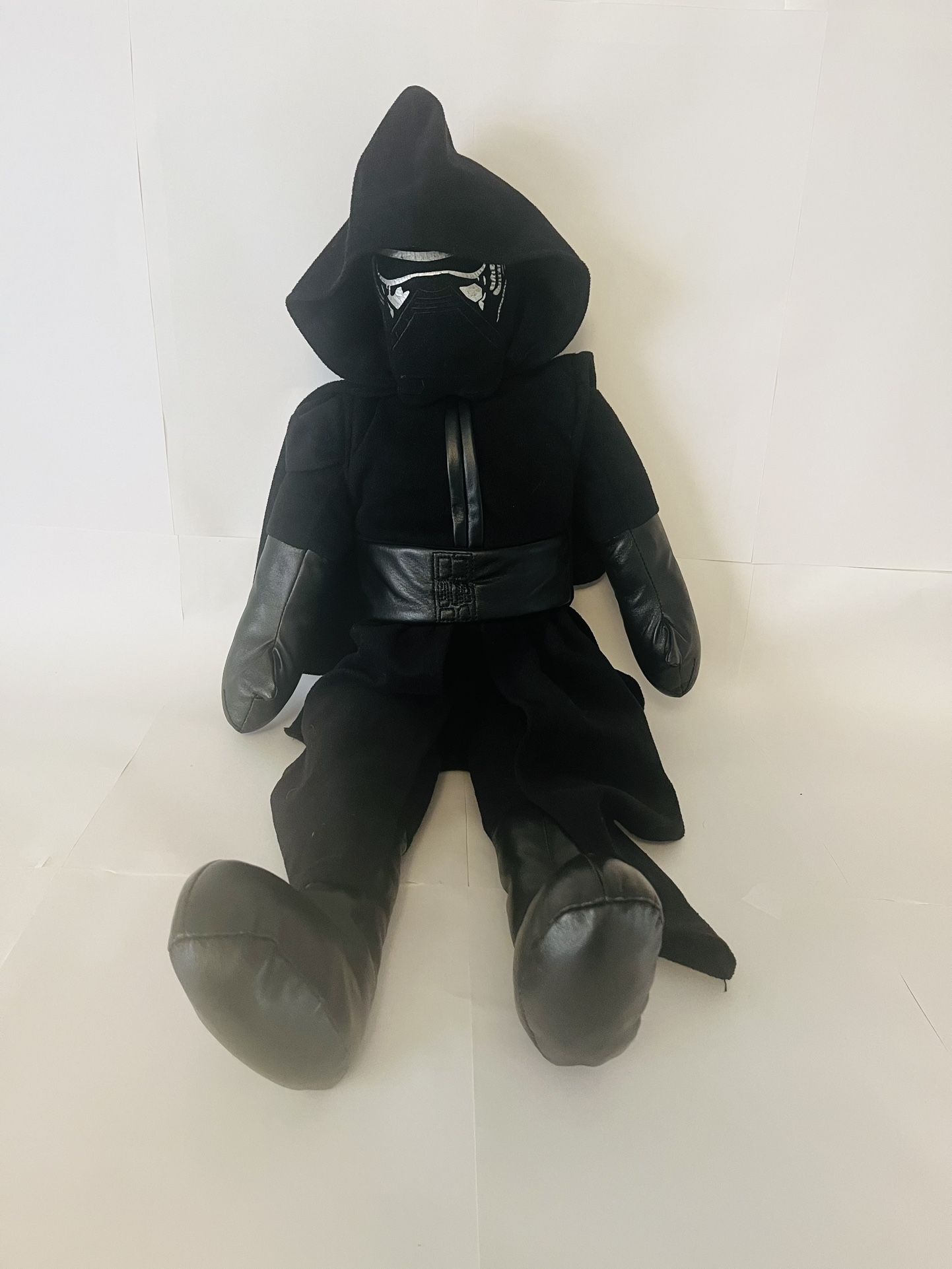 The plushie is of Kylo Ren from the Star Wars Movie: Force Awakens. There are no stains or tears in the fabric that I know of. This plushie is used but feel and looked close to new. The plushie is roughly 26 inches in length.