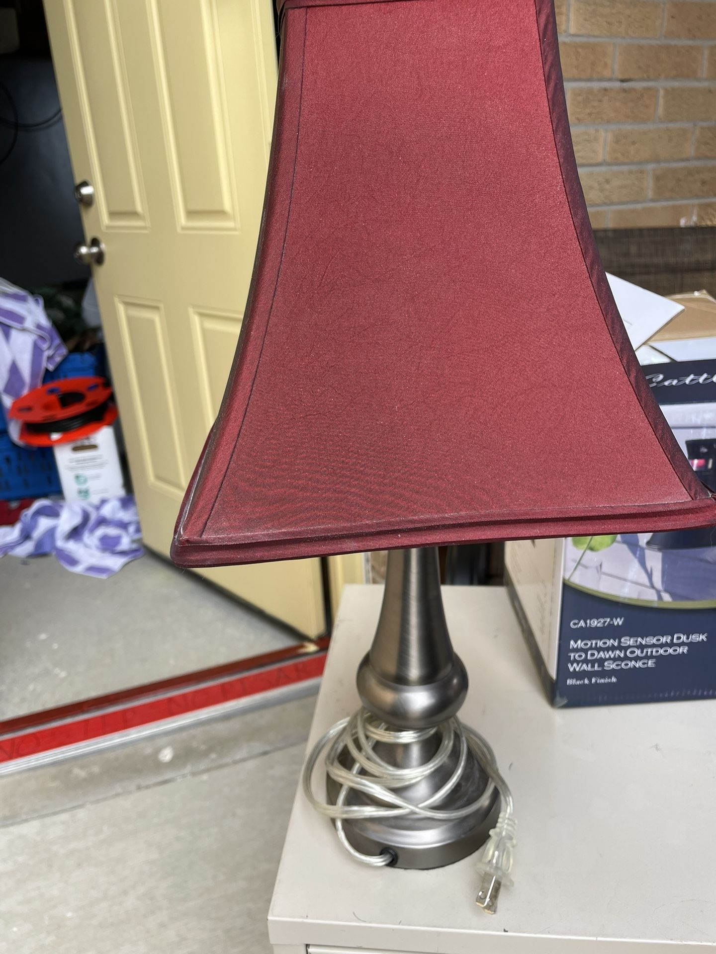 Silver lamp with burgundy lamp shade. Works great. Great lamp and easy to update lamp shade if you want.