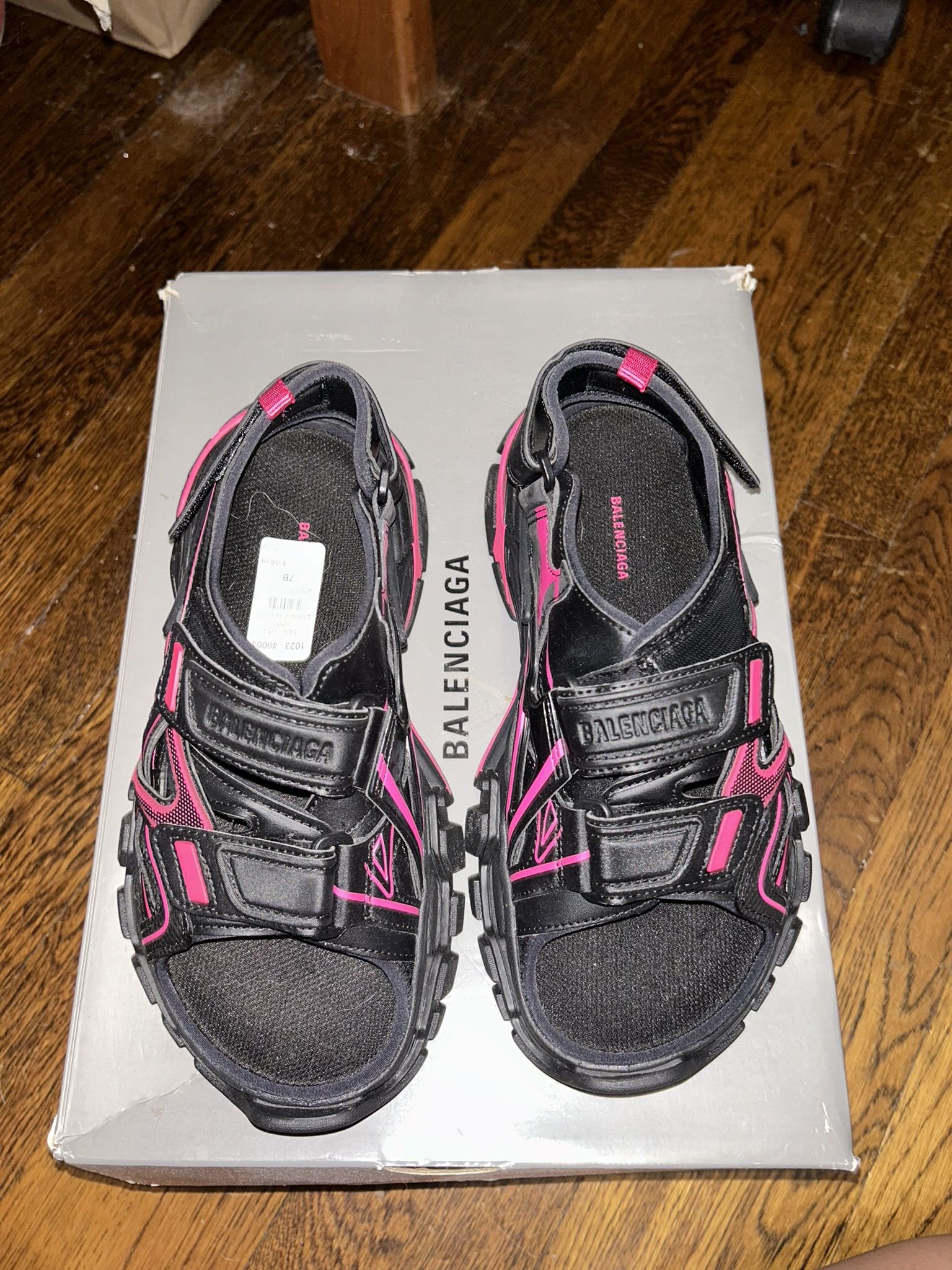 Brand new Balenciaga Sandal shoes never worn. Bought 2 years ago from Saks. Comes with receipt sticker, dust bag, original tags. Color is black and hot pink details. Perfect for elevating your summer outfits or riding atvs on vacation. It’s definitely a eye catching wardrobe piece and gives a very cool girl vibe when wearing!