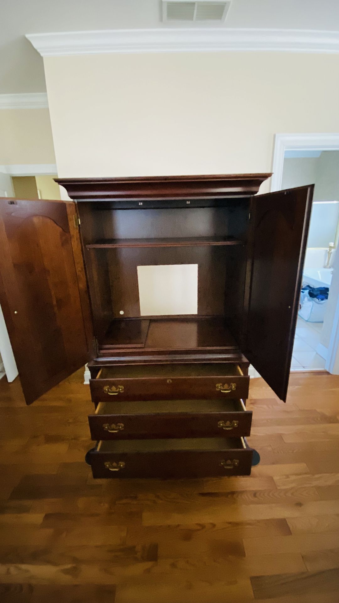 100% solid wood Made in America Available in the Carriage House Collection by Kincaid Classic 18th Century and The Queen Ann Period silhouettes Solid birch, linga, maple, and other select hardwoods in a rich cherry finish 2 doors 1 tray, Adjustable shelves 3 drawers TV Opening: W 34 1/2" X D 18 1/2" X H 32" Dimensions: 78" H x 43" W x 22" D Description Staying true to form from the classic 18th Century and The Queen Ann Period silhouettes, Carriage House’s style generates an image of well loved furniture that is still enjoyed today. The elegant carvings and hardware for this group were inspired from the most prized pieces from this period. There are over fifty plus pieces in the Carriage House group which include bedroom, dining, occasional, and home office. Jewelry and silverware trays adorn selected pieces. Carriage House is constructed of solid birch, Linga, maple, and other select hardwoods in a rich cherry finish. The beautiful craftsmanship of Carriage House along with its many choices will suit any individual’s taste.