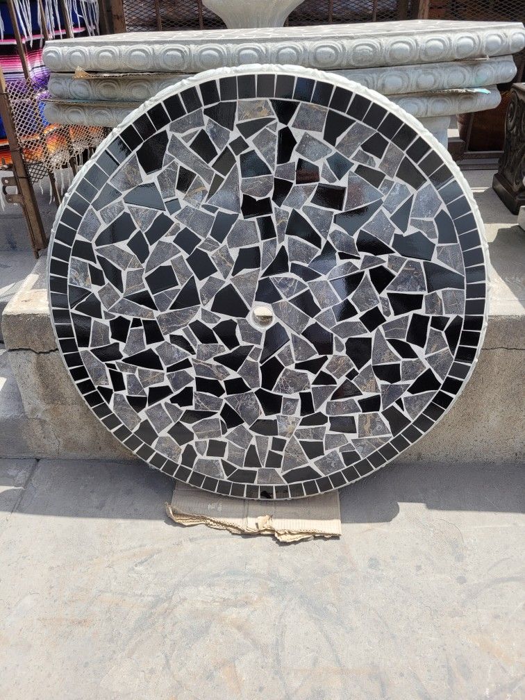 For sale is a brand new outdoor concrete table with black and grey tile top. It comes with matching bench seats (3). The first photo is the actual table, the second pic is an example of what this 11 pcs table looks like. Table top measure 42 inches. Table is extremely heavy, and delivery is available at a cost.