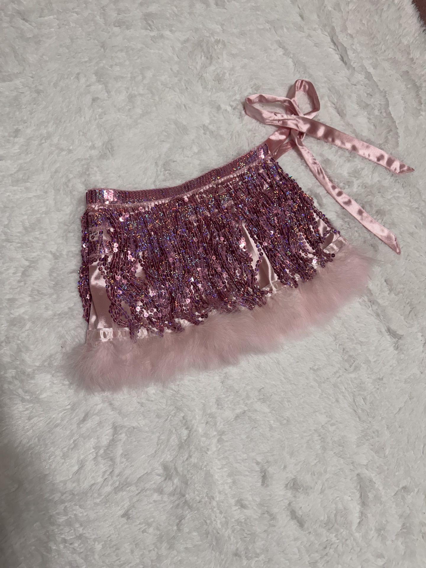 New Small pink sequin fringe fur iheartraves mini festival skirt rave raver