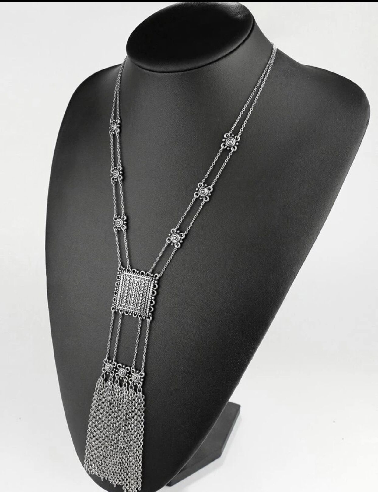 Beautiful Chain Tassel Charm Necklace For Women and Girls perfect for your festive dinner to night outs. Also a marvelous choice for a romantic dinner date or rooftop party, Style: Vacation Materials: Alloy Length: 16.3 inches Colors: Antique Silver Conditions: New For more information please see the pictures.