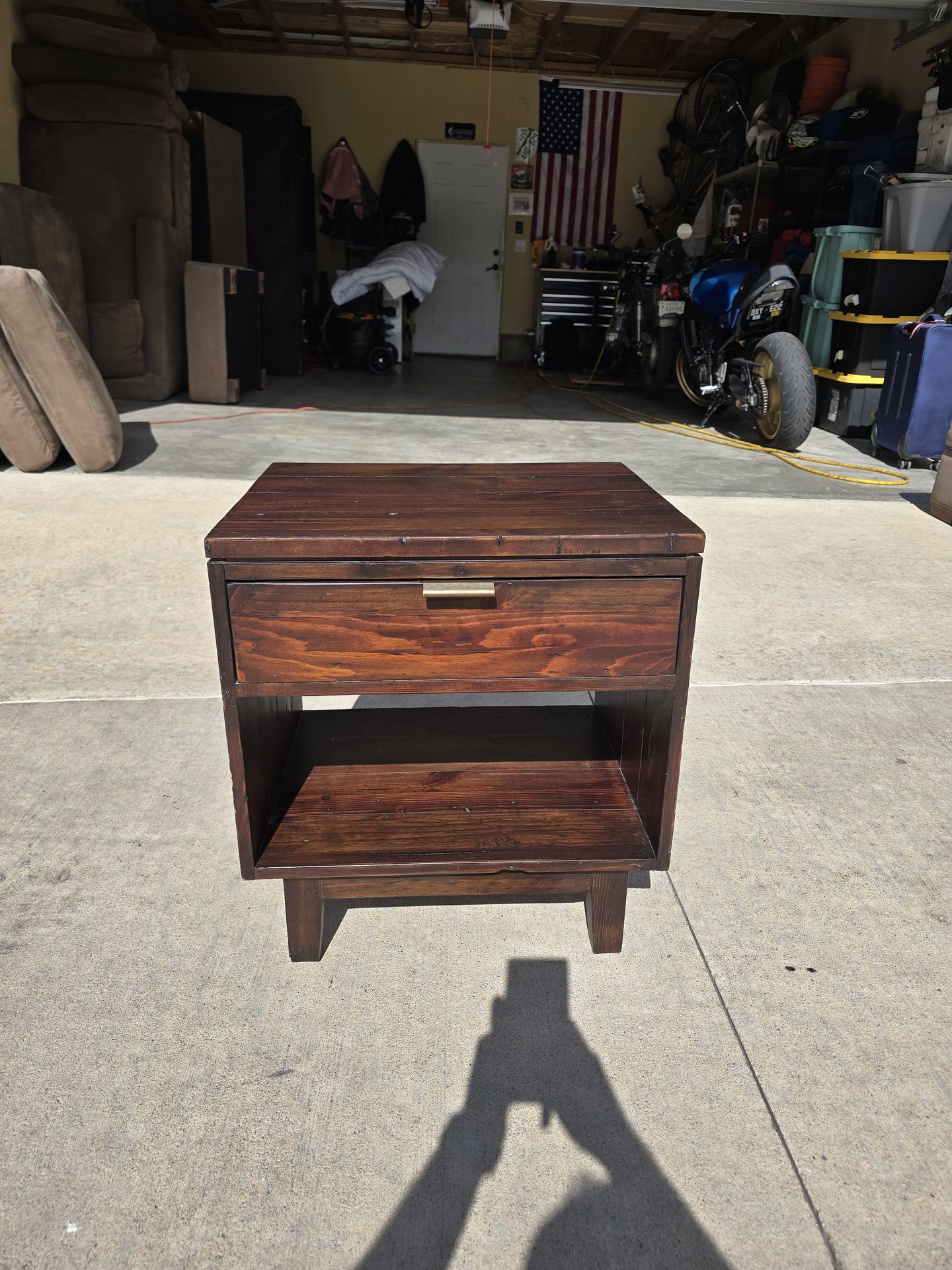 Solid wood rustic farmhouse nightstand in great condition. Dark stained wood with beautiful natural grain and distressed details. Features: • 1 storage drawer • Open bottom shelf for books or decor • Sturdy solid wood construction • Bronze hardware Originally around $400 new. Works great as a bedroom nightstand or living room end table. $140 OBO Pickup in Thornton.