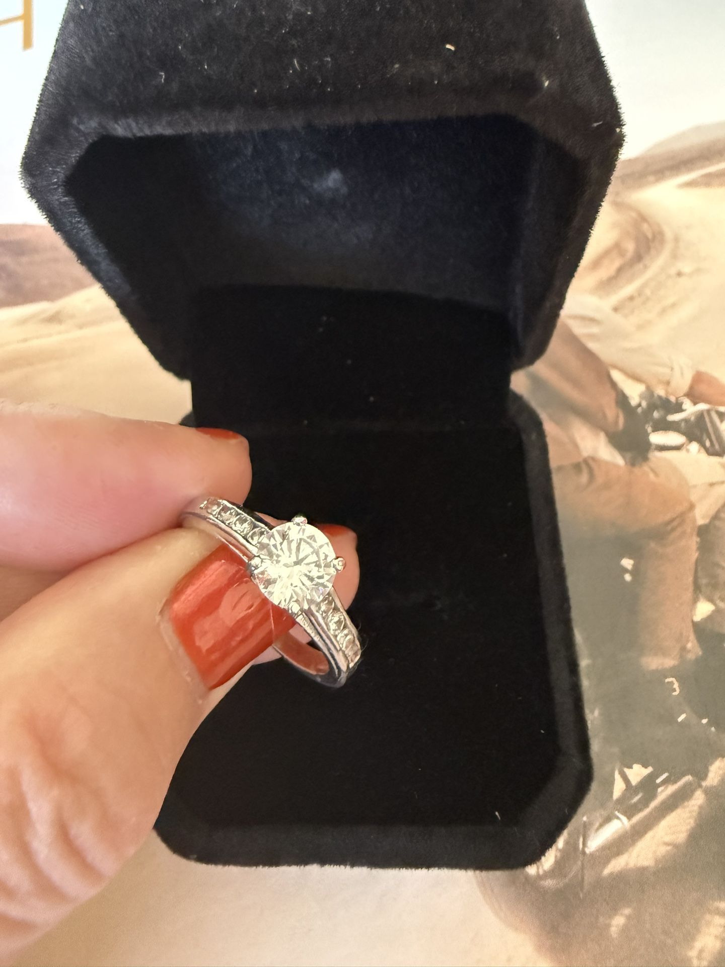14 K White Gold Ring. Size 8 Beautiful ring, unknown stones. Maybe CZ these do not test as diamonds but are gorgeous. Perfect traveling wedding ring for when you'd rather leave the real deal at home. Excellent condition, with box