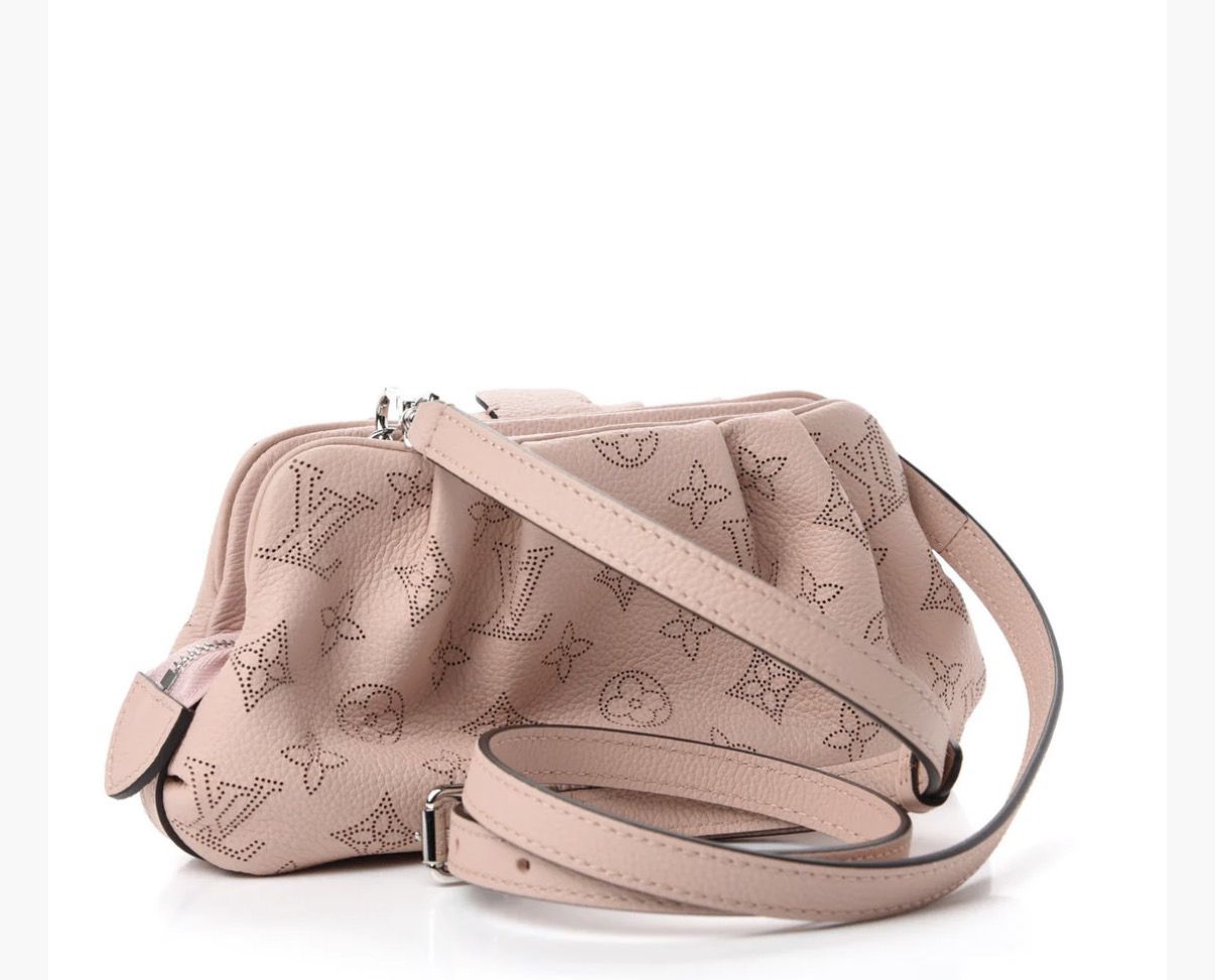 This is an authentic LOUIS VUITTON Mahina Scala Mini Pouch in Magnolia. This stylish pochette is crafted of soft Louis Vuitton monogram perforated leather in pink. The bag features an adjustable leather shoulder strap with silver hardware. The top zipper opens to a matching fabric interior with a patch pocket. Year 2020, box, pouch and receipts all available.