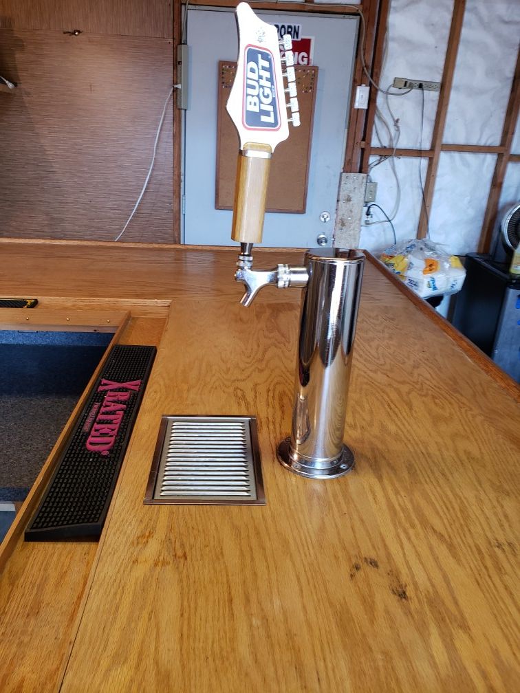 Sold wood construction bar with built in tap and drain area. Comes with four stools. Great for a patio or garage man cave. Best offer takes it home this weekend.