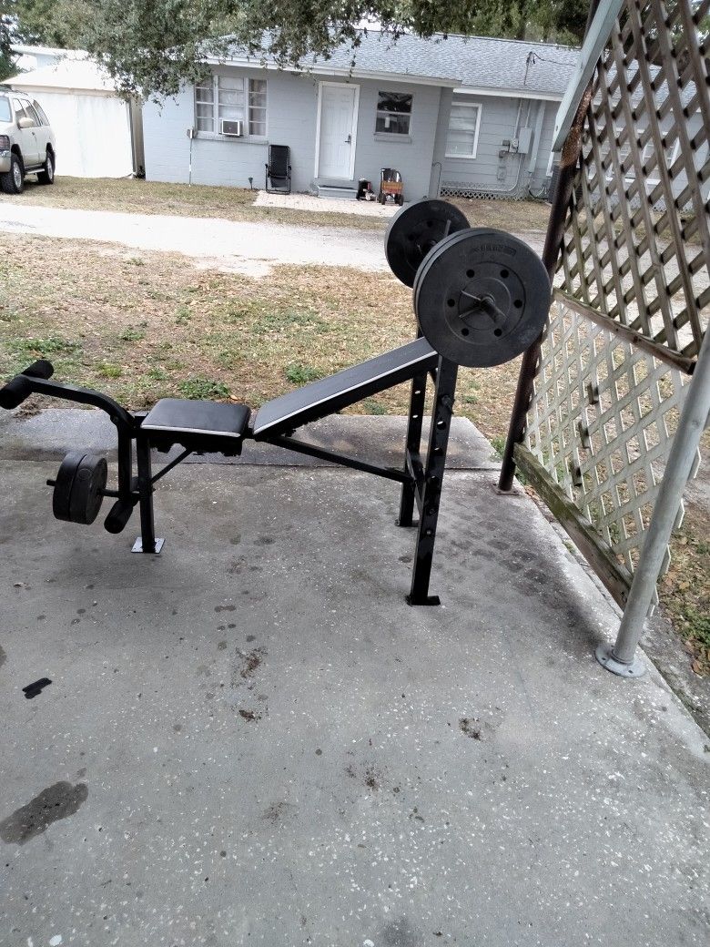 Bench press with leg extension, bar and 100 lbs. of weights. Cash only must pick up.