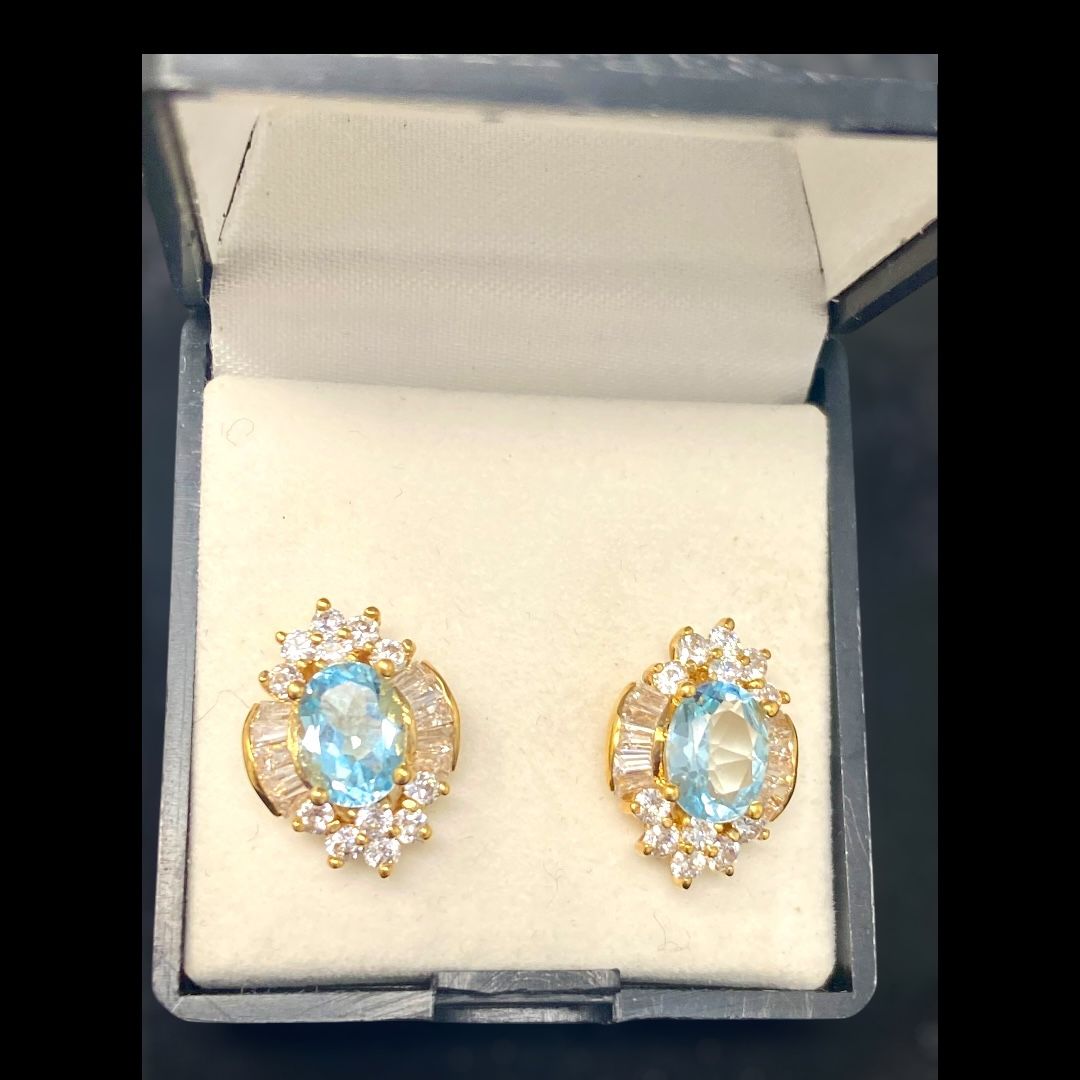 These KAS Luxury earrings feature genuine blue topaz as the main stone, accented with white quartz. Crafted with 14k gold plating in a cluster style, they are suitable for pierced ears. The earrings are pre-owned but have never been worn, originating from China and coming in their original box. Ideal for birthdays or special occasions.