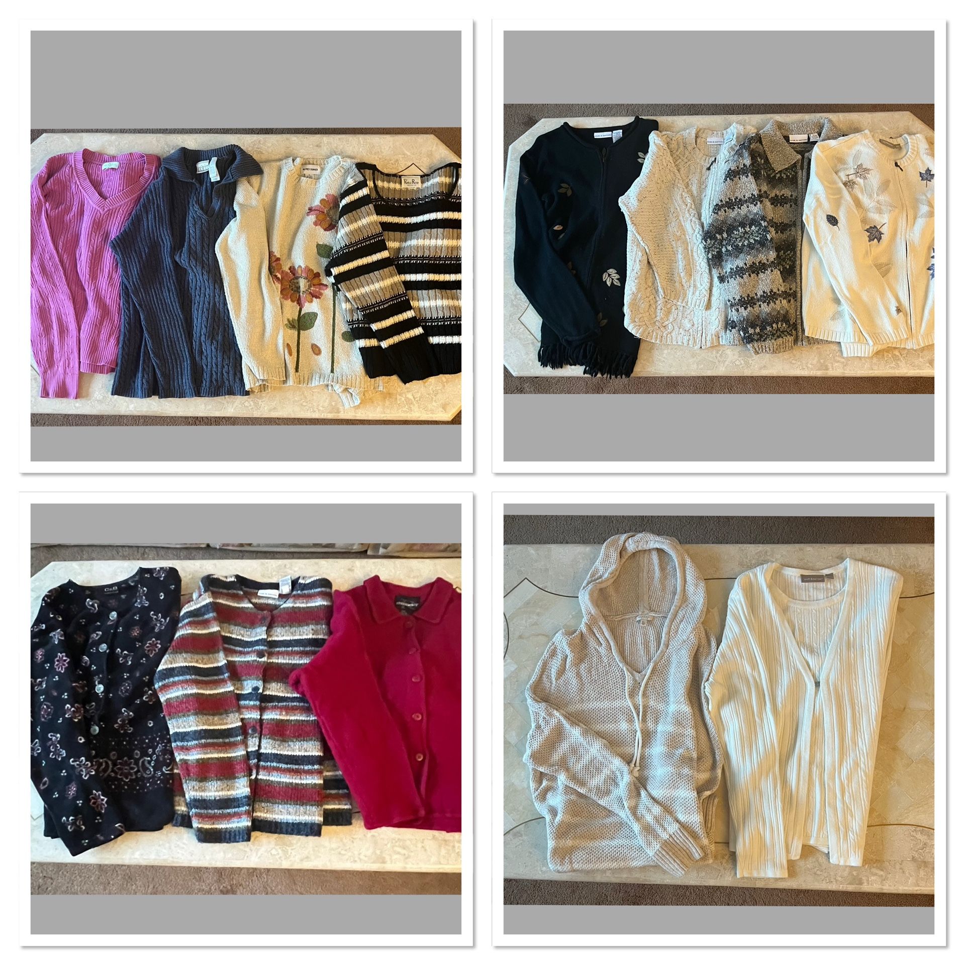 All in excellent like new condition. Cleaning out closet ALL size XL Sweaters, button down tops, t-shirts, tank tops, sweatshirts, fancy tops. MANY MANY TOPS!! Many barely worn. Take all pictured for $100 WHAT A DEAL!!! Or messenger for individual pricing. Tried to group because to nuch to show all individual pictures. Come check them out. Or make me an OFFER I can’t resist.