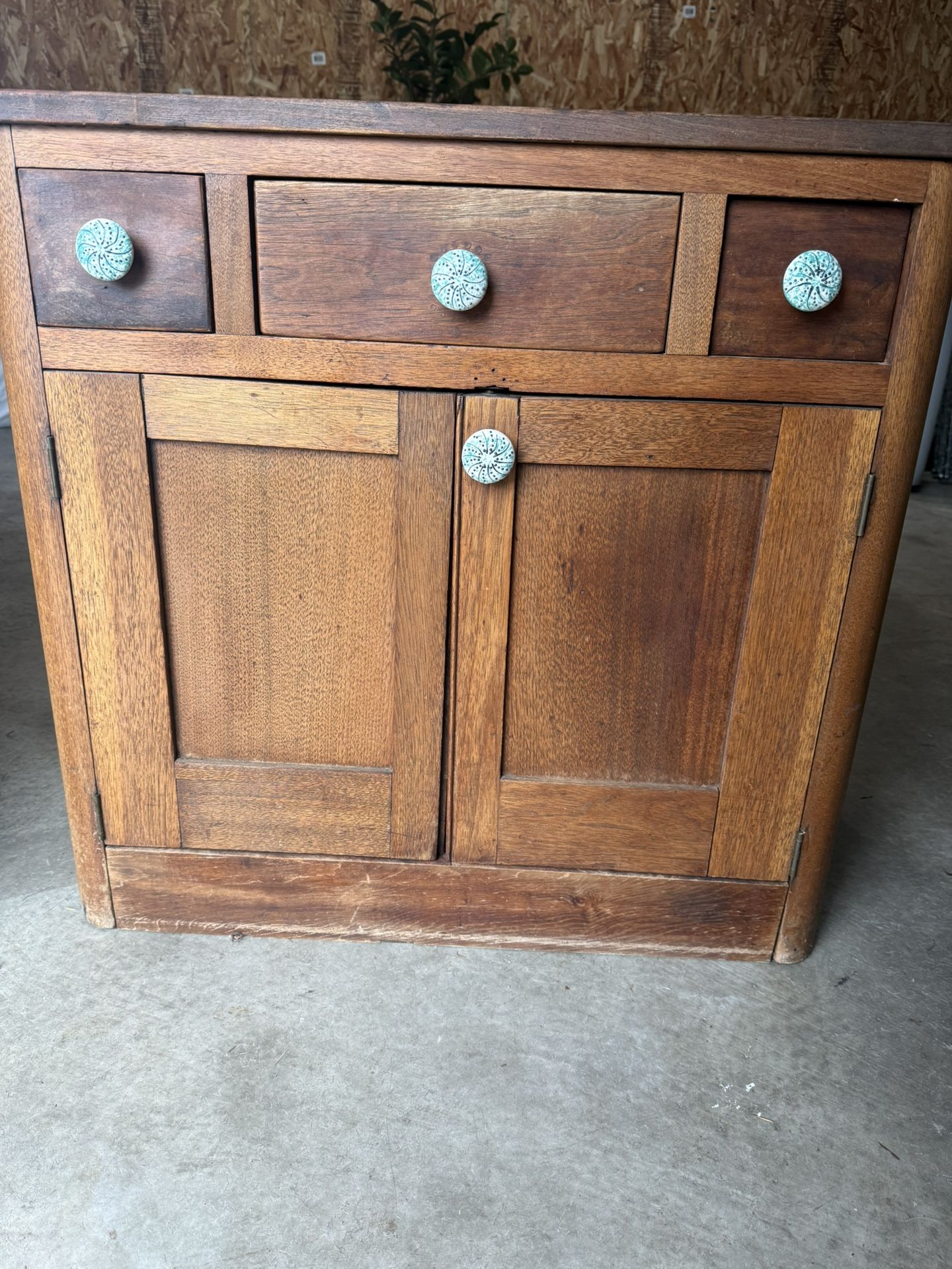 Solid wood storage cabinet- with hole for cords DIMENSIONS 31”(l) x 19.5”(w) x 30.2” (ht) Bottom slatted base inside: 17.5” x 28.5” Inside height: 16” Middle drawer: 17” x 12” (w) x 4” (d) Narrow drawers (x2): 17” x 5.5” (w) x4” (d) Easy slide drawers A bit heavy but management with 1 strong person. Must pick up and load FREE