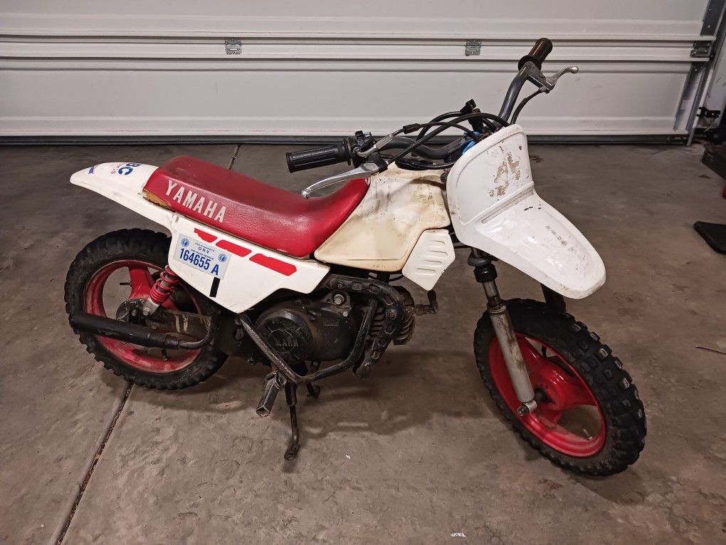 Yamaha PW 50. 1990 year. The bike is cold-blooded to get started sometimes but runs great after it starts for the first time of the day. It's a bit beat up and the plastics have some fading but new plastics are cheap and it needs nothing to go ride. No title but the title is clean. Son outgrew it.