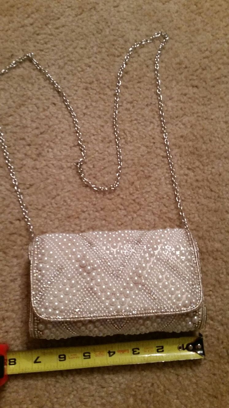 I used this purse once for my wedding, really not used at all. It's small, beautiful it has pearls and diamonds with a thin metal chain, the chain is removable to turn into a clutch. $20
