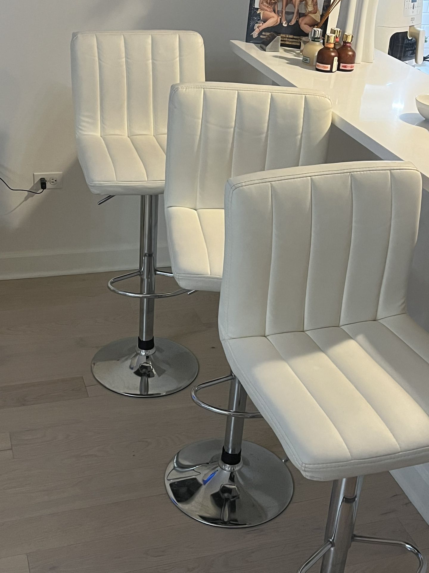 3 white soft leather bar stools in great condition $125. No Exceptions.