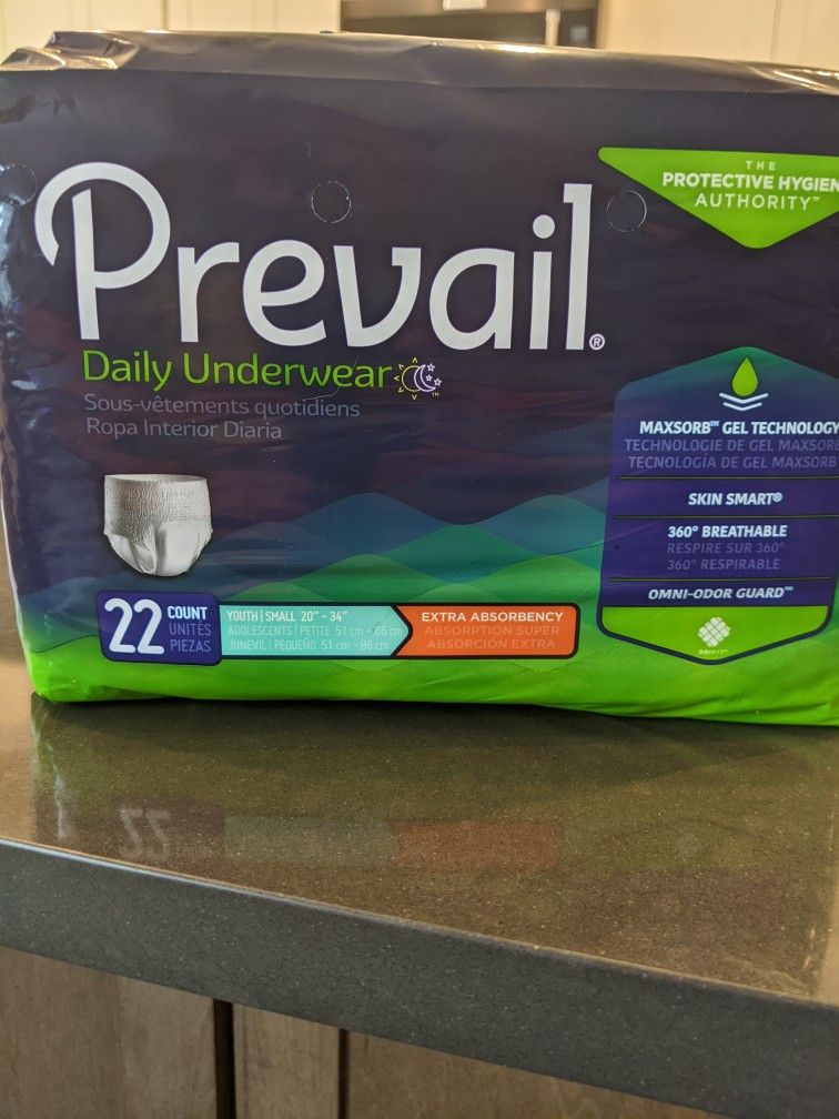 I have 24 bags of prevail training pants / absorbent underwear . These are a youth small size 20" - 34 inch . There are 22 pull ups in each bag. These are selling for 12.40 a bag on Amazon. I'll sell these for 9.00 a bag or 34.00 for a case of 4 bags ( 88 pullups in a case)