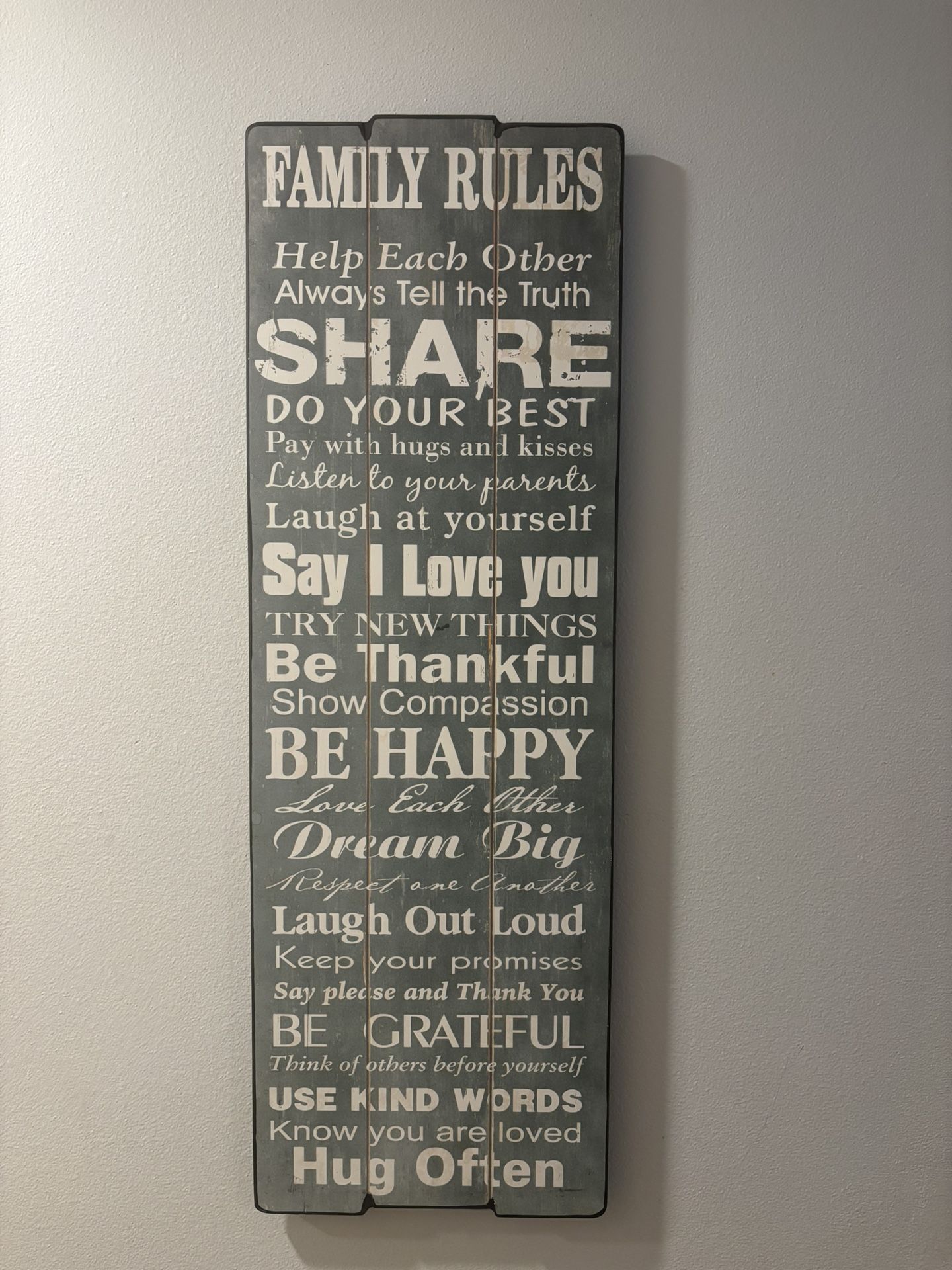 Style: Distressed gray wood with white lettering—looks great with almost any decor. Size: It’s a tall vertical piece (roughly 1 foot wide by 3 feet tall), so it’s perfect for those narrow wall spots or entryways. Condition: Like new! No dings or scratches. Setup: Super easy to hang; it already has the hardware on the back.