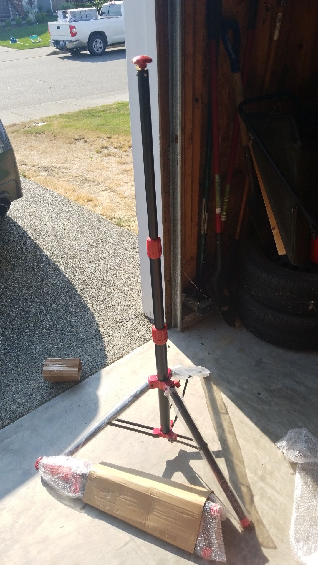 2 Brand new tripods black and red with threaded bolt on top for mounting your light or whatever. Raises to almost 5 feet.