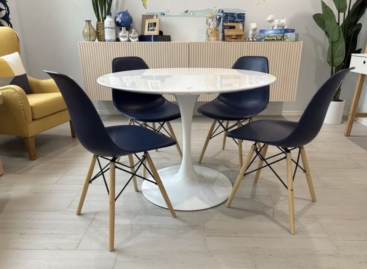 (1) WHITE MELAMINE TABLE: 39"DIA X 28"H; (4) DEEP NAVY MOLDED PLASTIC CHAIRS W/ BLACK WIRE & NATURAL BASES, HAVE MINOR SCUFFS, SCRATCHES & DINGS: 18"W X 17"D X 32"H (SEAT: 18"H)