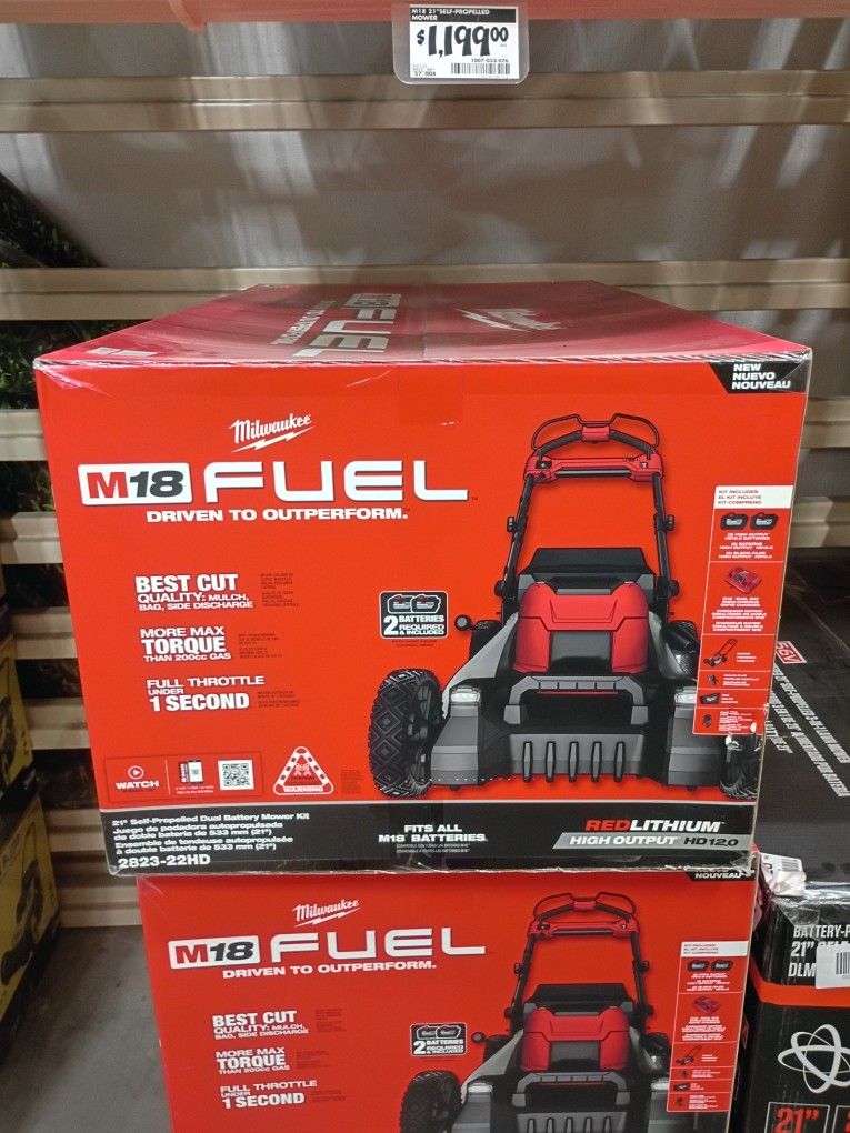 Milwaukee electric lawn mower model m18-2823-22 HD best cut 21 inch cutting blade comes with a quality mulch bag for side attach discharge mulch grass catch bag this lawn mower model has more maximum torque than a gas motor drive lawn mower the motor is a 200cc electric drive powersports motor it reaches full throttle in under one second with more power than a gas lawn mower has a 21 inch cutting blade self-propelled comes complete with two (separate dual batteries ) and a mower kit included the two high output HD 12 volt batteries also comes with a M18 dual Bay simultaneous rapid battery π charger system for quick charging of two batteries comes with a Mulch plug bag ποΈ that attach to the side of the lawn mower the lawn mower is brand new inbox never open( original price is $1,199) the asking price is ($ 700.00 ) make your own offer.