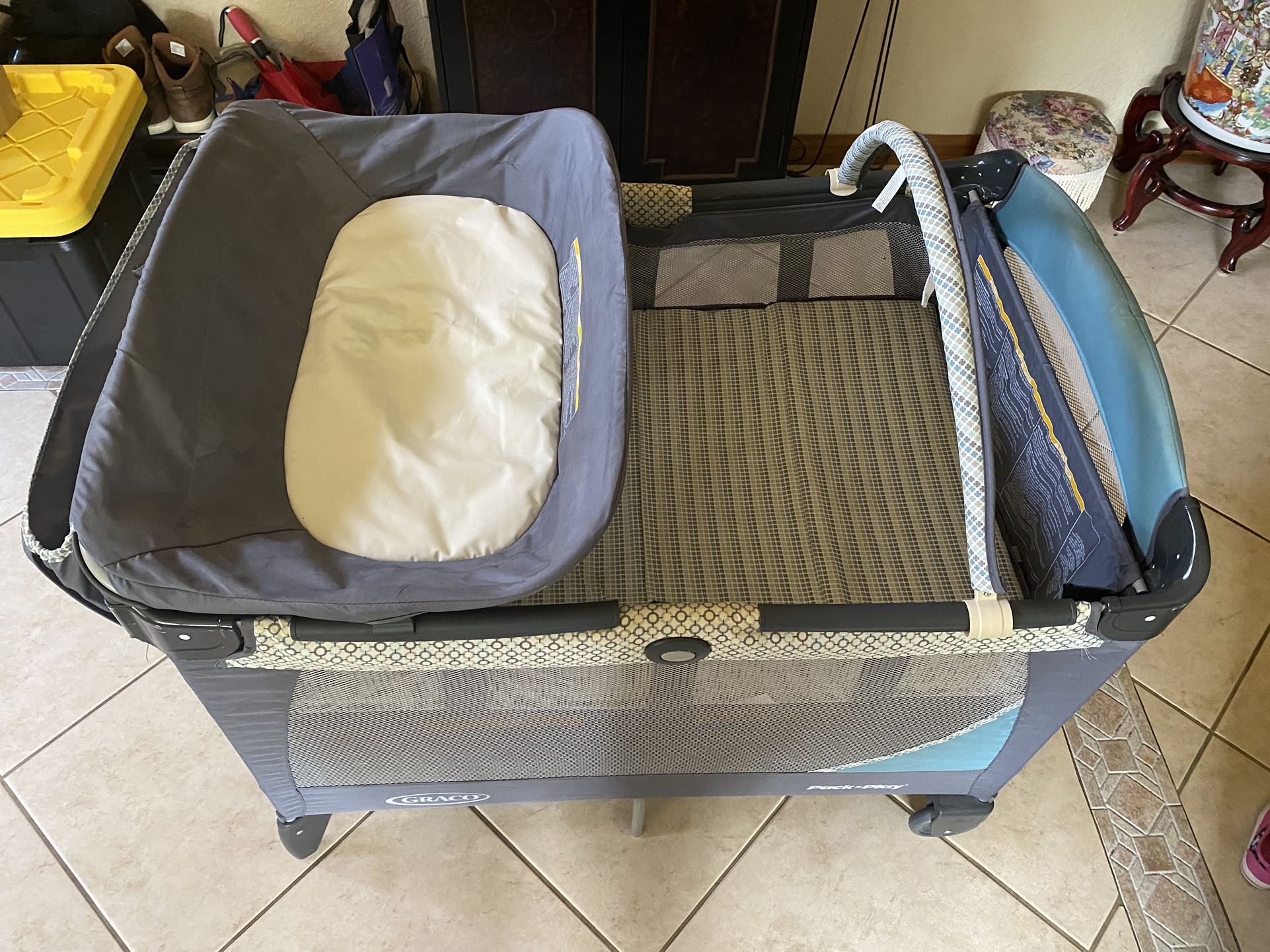 Selling a grey with hints of light green, blue, and beige Graco pack ‘n play. Has a changing table with storage for diapers, wipes, and anything else for the baby’s needs. It’s just missing the 2 Velcro stars for the arc but anything can Velcro there in its place. Asking $55