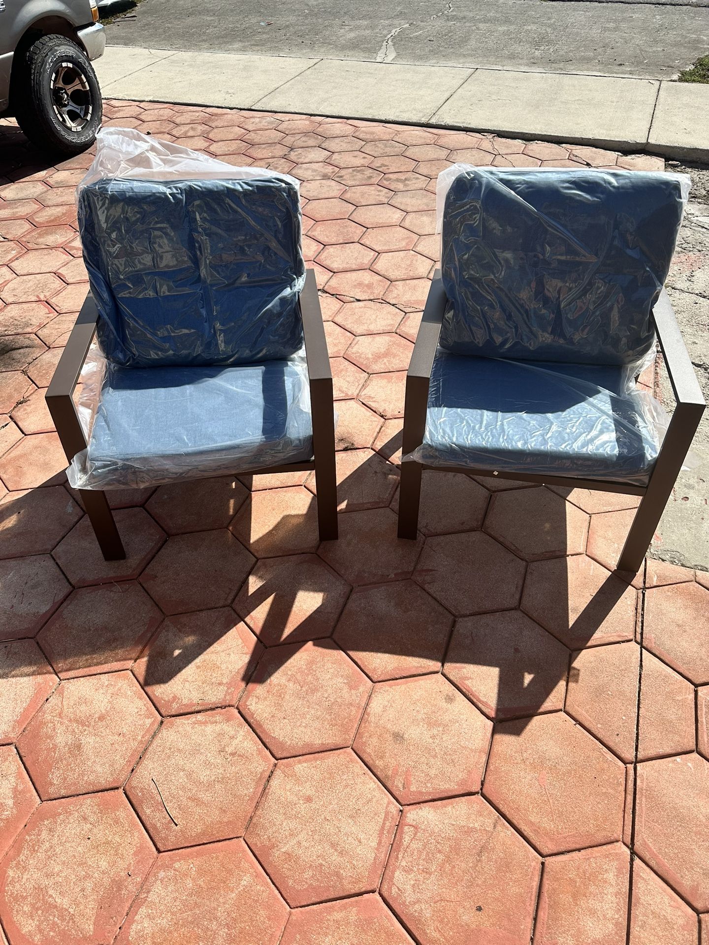NEW AND NEVER USED 28 inches tall 29 inches deep SET OF 2 ULTRA STRONG AND ULTRA LIGHT SUN AND WEATHER PROOF BROWN ALUMINUM NAVY BLUE CUSHIONS The metal patio furniture is made of high-quality aluminum, ensuring durability and long-lasting performance. The aluminum frame provides stability and corrosion resistance, making it perfect for outdoor conditions and guaranteeing your patio set stays looking great season after season. ✔❤ Zipper Cushions for Easy Cleaning: The cushions on our aluminum outdoor furniture sets feature an invisible zipper, making them easy to remove and clean. The cushion covers are designed for hassle-free maintenance, allowing you to keep your patio set looking fresh and new with minimal effort. ✔❤ Premium OLEFIN Fabric: The cushions are upholstered in top-grade 240G OLEFIN fabric, known for its breathability, fade resistance, and durability. This high-quality material ensures your cushions stay comfortable and looking great, even after prolonged exposure to the elements. ✔❤ 4" Thick Sofa Cushions for Ultimate Comfort: Our aluminum patio furniture features 4-inch thick cushions filled with high-resilience, high-density sponge, delivering superior comfort for long hours of lounging. Perfect for enjoying your outdoor space in style and relaxation. ✔❤ Elegant Design with Modern Aesthetics: The sleek, contemporary design of this aluminum patio furniture set is sure to enhance any outdoor space. Whether you're relaxing on the patio or hosting a gathering, its sophisticated appearance blends well with various outdoor décor, adding both functionality and style to your space. Feature: Aluminum Frame: Durable, lightweight, anti-fading, anti-rust, and anti-corrosion, requiring minimal maintenance. Widened Seat Width: Offers extra comfort for a more relaxed seating experience. Thickened Seat Bottom: Provides increased stability and sturdiness for long-lasting use. Upgraded Olefin Fabric Cushions: Soft, breathable, fade-resistant, and designed to maintain comfort over time. Zipper Design for Cushions: Cushion covers are removable and easy to clean, ensuring hassle-free maintenance. Durable Aluminum Imitation Wood Tabletop: Stylish yet robust, providing a chic, practical surface for outdoor spaces.