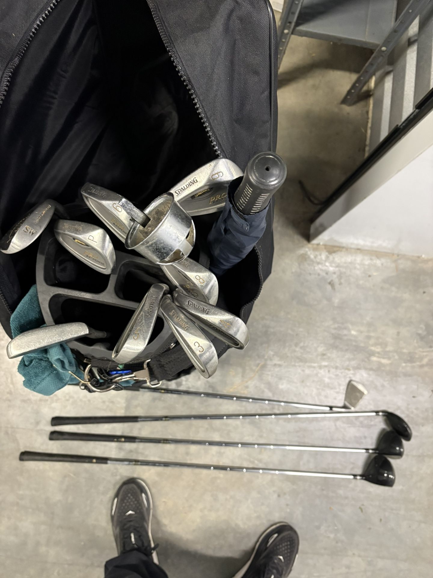 Full set of left-handed Spalding pro response golf clubs including covers umbrella & ball catcher Balls & tees