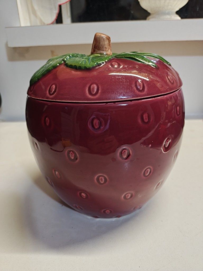 1990s Burgundy collection, ceramic cookie jar. 7 inches high with lid. 7 inches wide. In good condition. No cracks or chips.