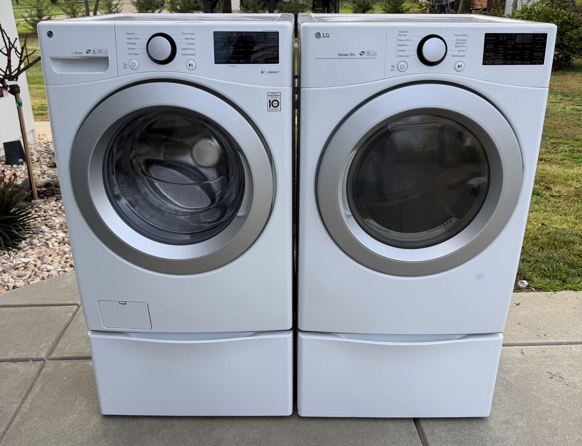 LG washer and dryer with pedestals. No issues at all. Everything works well. Clean too. With pedestals. Dryer is electric. Both come with manuals. Can deliver for extra