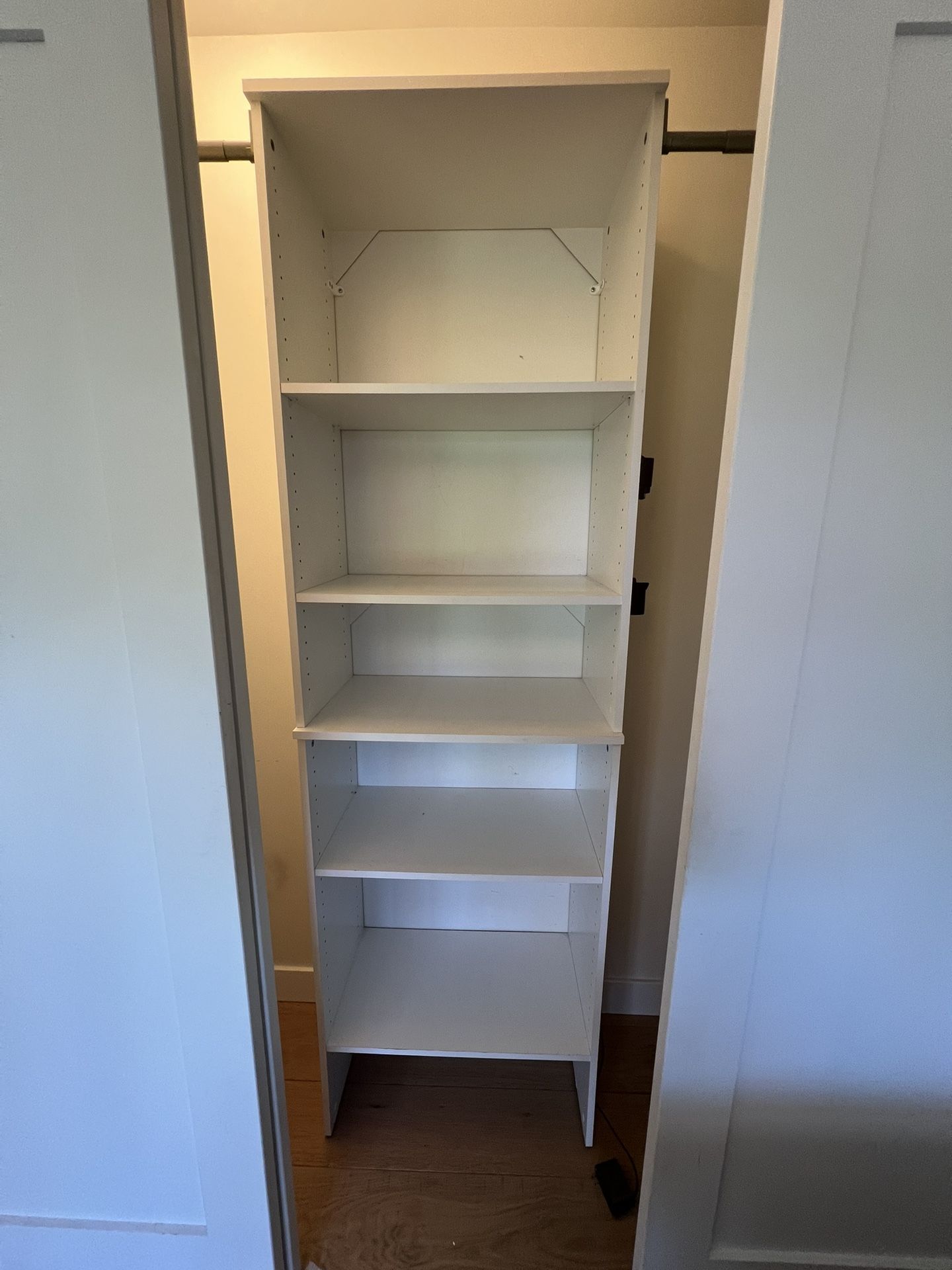 2 feet wide by 7 ft tall. Comes with two extendable closet rack bars.