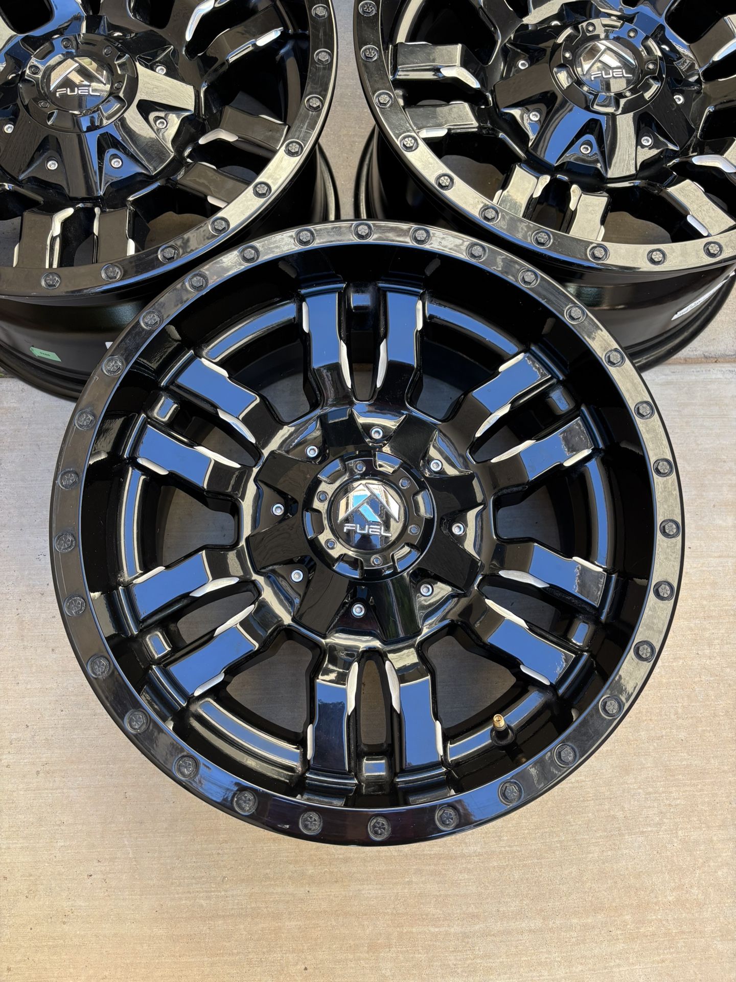 17 in. Fuel Wheels Had 37x12.5x17LT tires on them. Wheels were on a Jeep Wrangler Rubicon for a little over a year. Ended up changing to a larger wheel size to accommodate new tires so no longer need these. Gloss black with silver accents 5 wheels *pics of what they looked like mounted on Jeep