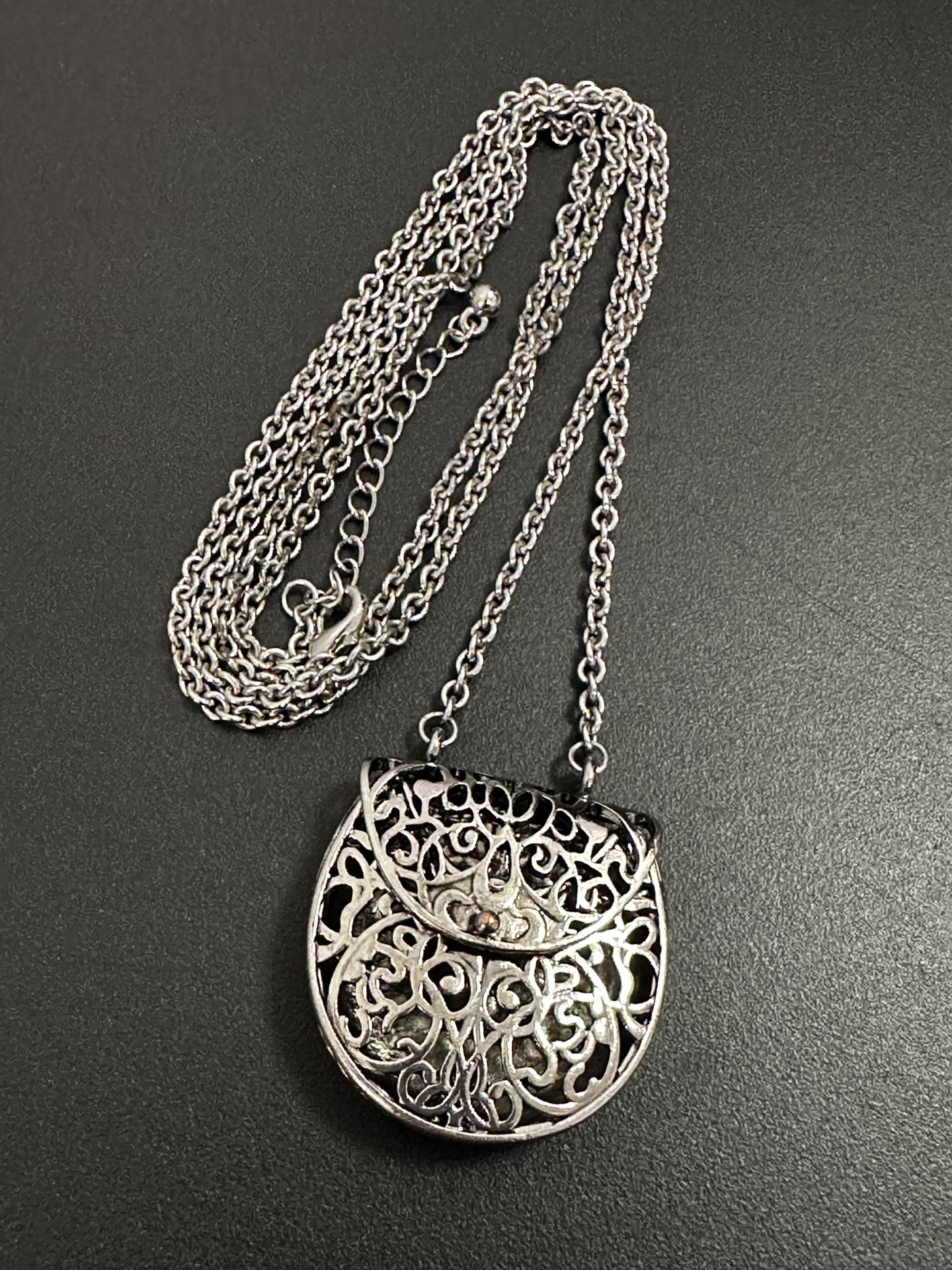 This vintage necklace features a silver-tone purse pendant suspended from a chain. The pendant serves as a unique and stylish accessory, perfect for those who appreciate antique jewelry with a touch of elegance. Magnetic closure. In great condition. As is