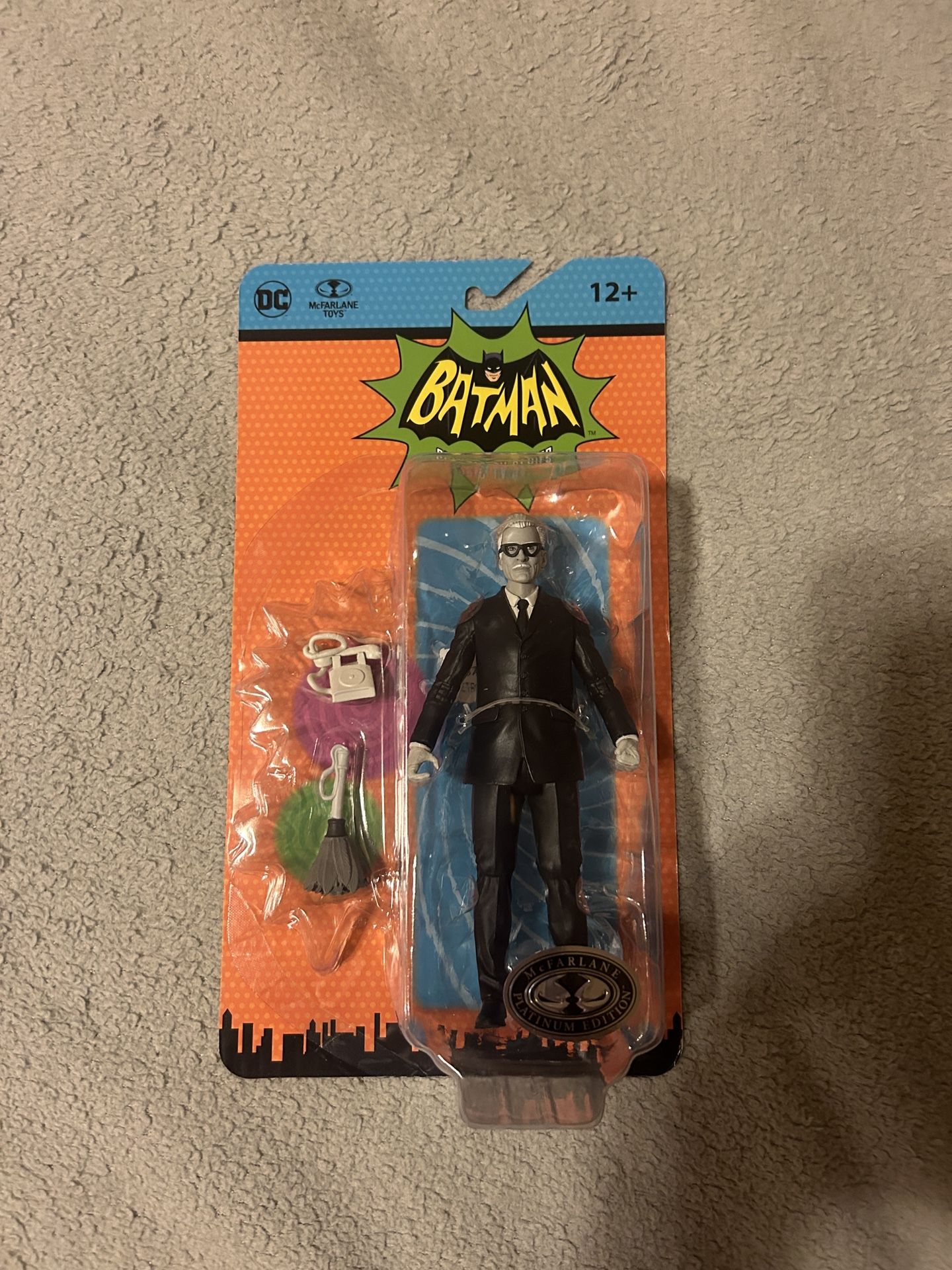 Introducing the McFarlane Toys Alfred Pennyworth Action Figure from the DC Retro: Batman 66 collection. This highly detailed figure depicts the iconic butler in his classic outfit, complete with a Phone and Duster The figure is made with high-quality materials and stands at approximately 6 inches tall. This collectible item is perfect for any fan of the DC Universe and action figures alike. The Alfred Pennyworth Platinum Edition is a must-have for any Batman enthusiast, and is sure to be a standout piece in any collection.