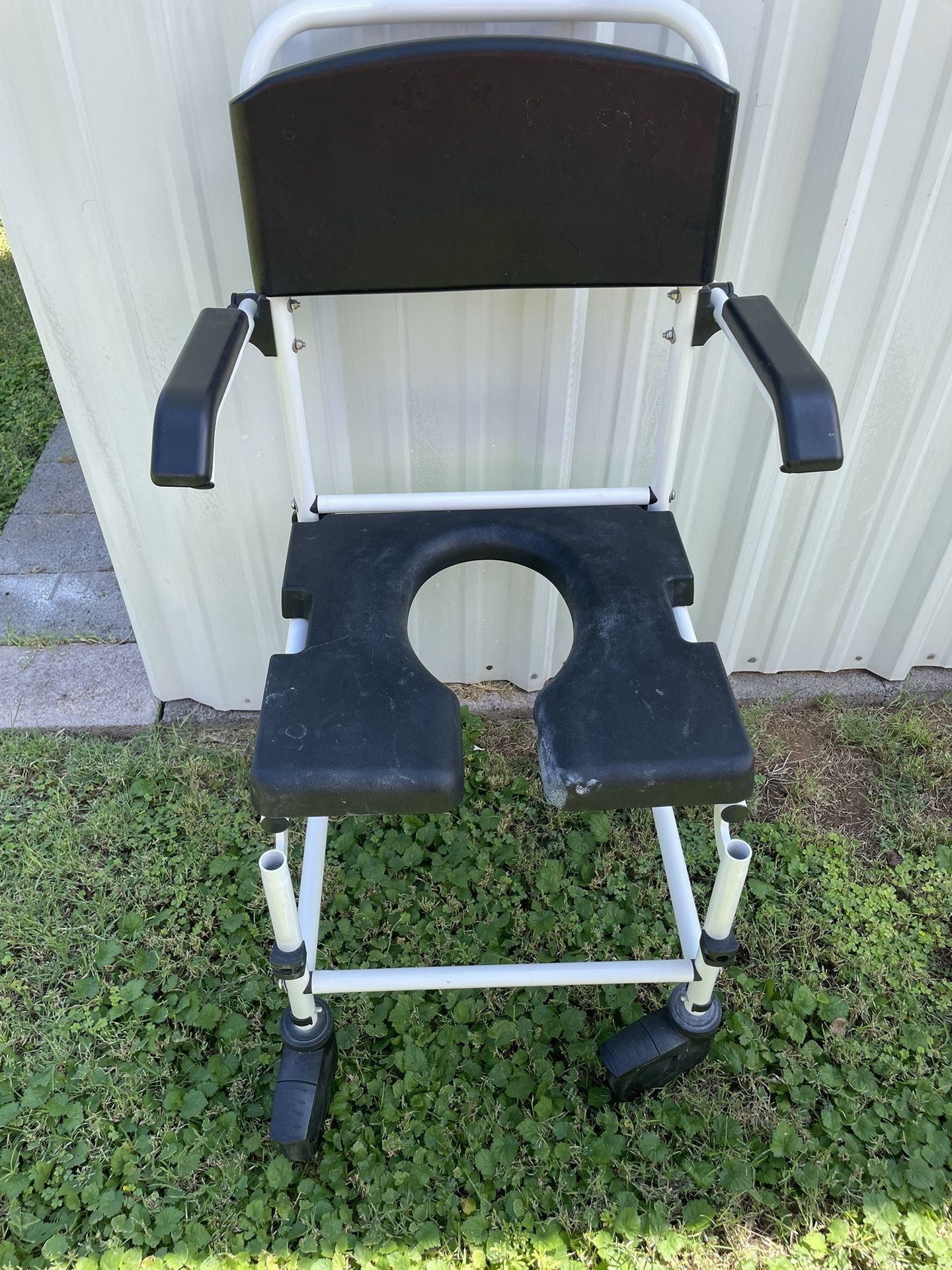 This can be used bedside with a rinsable gray bucket (missing but can be purchased separately) or over your own toilet to in order to have a raised seat (this is how we used it). The arms swing up for east of transition. Fully adjustable and sturdy with locking wheels. Slight staining on black plastic from hard water (we used it as a shower chair a few times).
