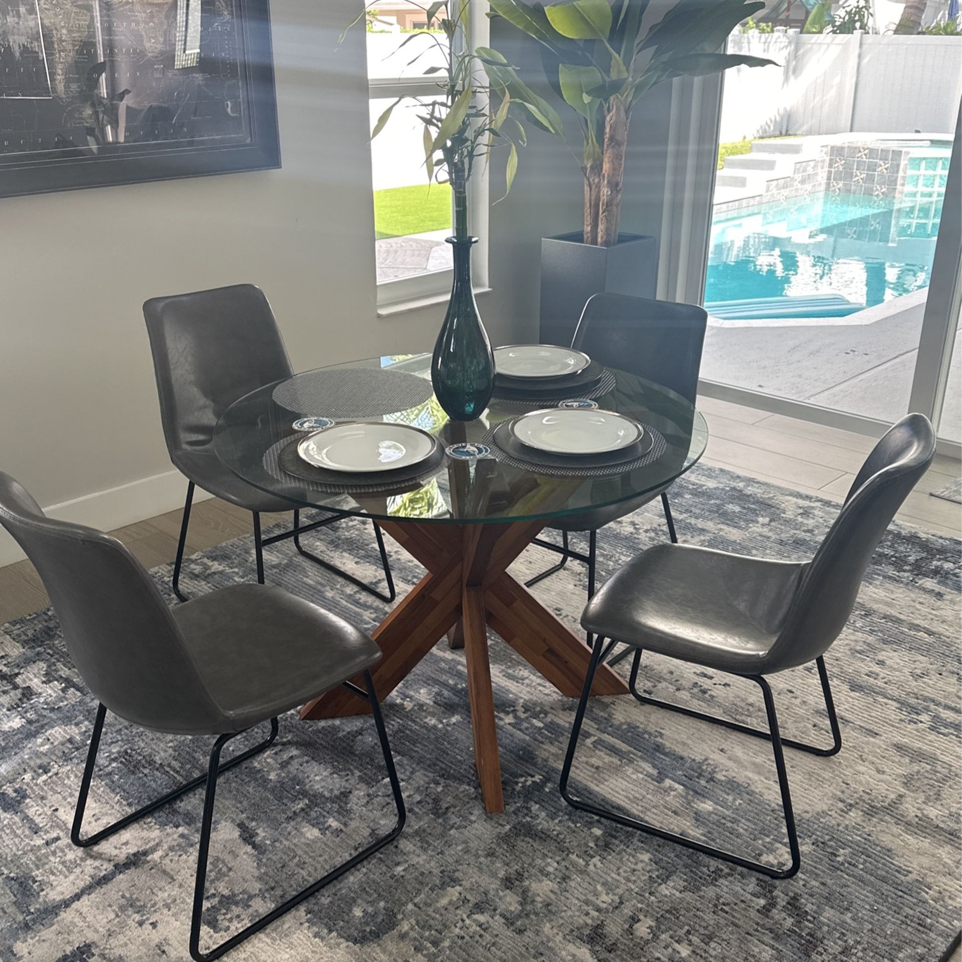 The glass is 42” and the height is 30”. No chairs included. Just table base and glass. Very nice, simply replaced with a larger table in this room.