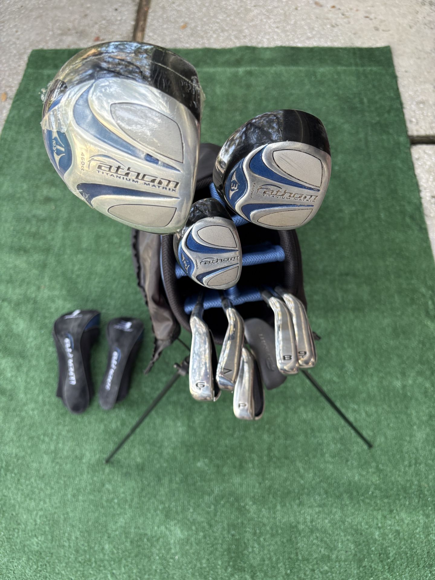 Fathom Titanium Matrix Golf set The driver is 460cc and 10.5° loft. The hybrid is a 4/5 (23°). The set includes irons 6, 7, 8, 9, a pitching wedge (P), and a putter. The clubs are right-handed. Bag included.