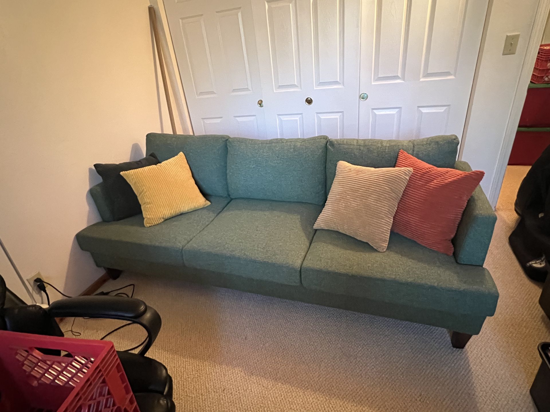 Mid-Century Modern Green Couch – Super Comfy Great mid-century modern style couch with deep seats and a beautiful green color. Very comfortable and roomy (fits 3 people easily). Works great in a living room, office, or apartment. Good condition and ready for a new home. Approx. 89” long with nice deep seats. Message me if you’re interested!