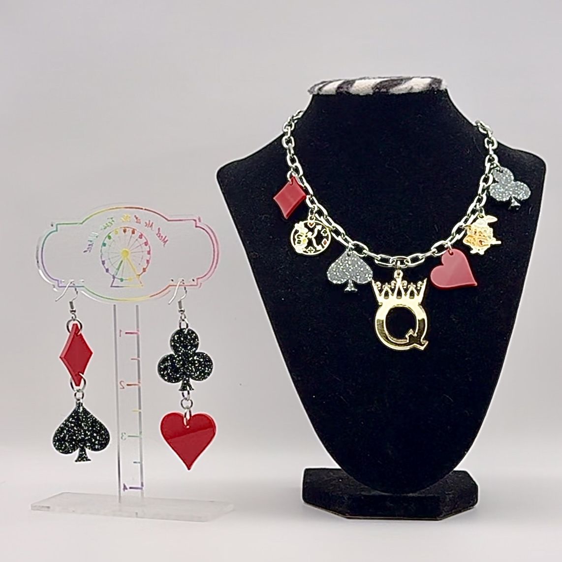 Handmade by Me. Prices firm. Most charms made from laser cut acrylic. Chains and earring hooks are stainless steel. Adjustable length Necklace $25 Earrings $18 Set $40 Alice in wonderland Queen of hearts cosplay Beyond wonderland Escape Halloween
