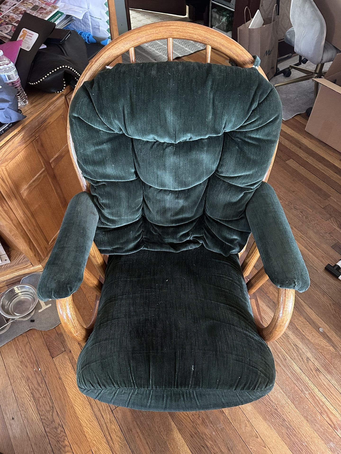Green cushion with a strap missing causing a hole,. Can use different cushion if needed. Real wood. Heavy rocking chair otherwise in good condition.