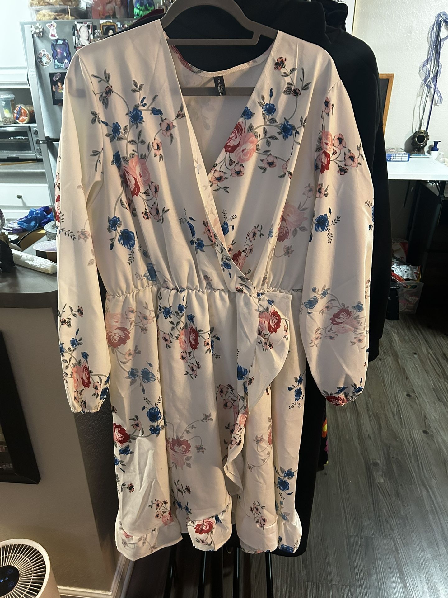 White. Beautiful dress. Size 16. Just below the knee