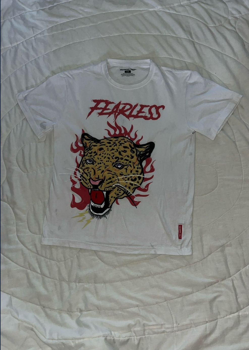 Members Only Fearless white T Shirt with cheetah face stitch in. Small/ Petite Striking and different styled t-shirt. Some stains in the front and back of shirt shown in the last 3 pictures. Lowered offers are accepted! Check out my page for more unique clothing!